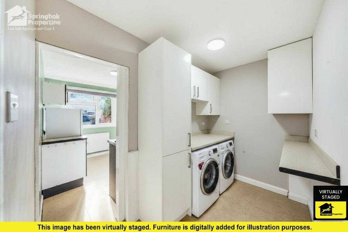 The contemporary kitchen pairs slate-toned cabinetry with pale worktops and a large Belfast-style sink, while the adjacent utility area provides handy additional space for appliances and storage. A newly updated family bathroom sits on the ground floor, feeling sleek and spacious with a separate bath and shower, modern tiling and clean finishes.