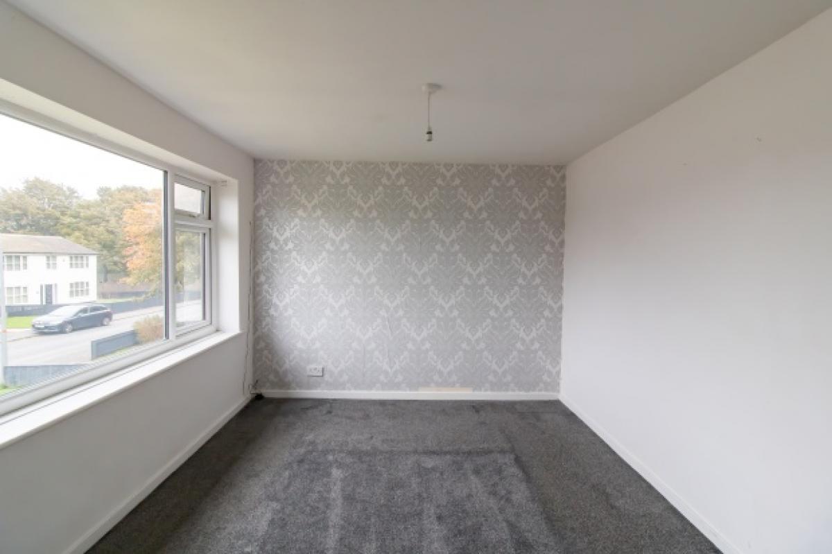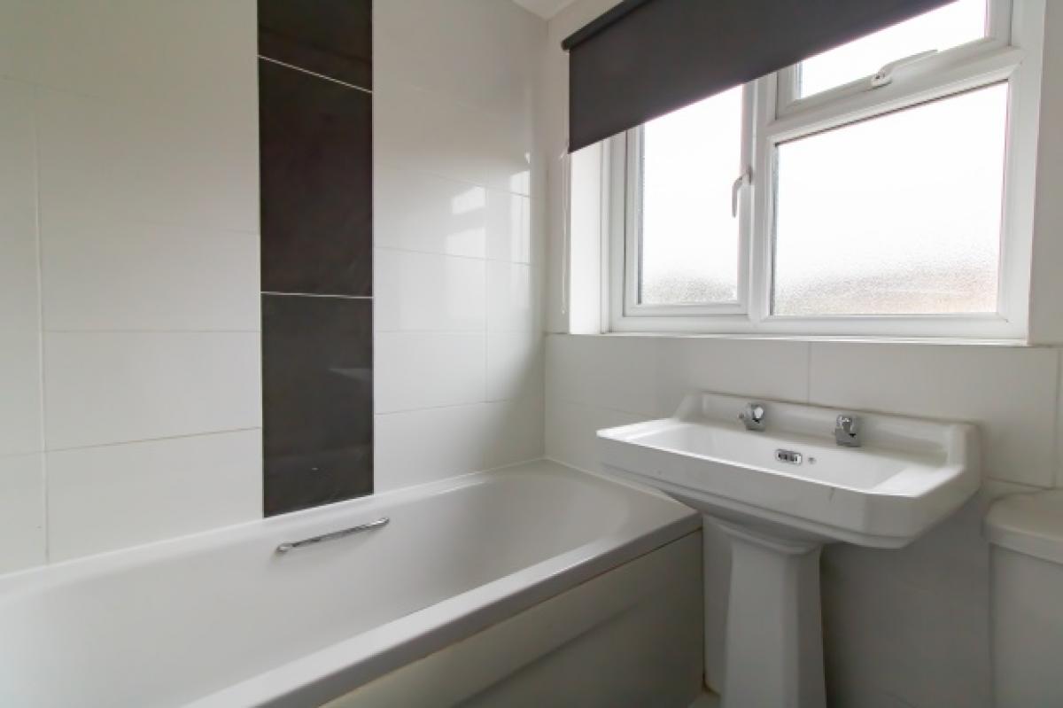 Upstairs, two well-sized rooms enjoy excellent natural light, alongside a contemporary bathroom with a clean white suite. Outside, the property benefits from a lawned garden enclosed by fencing, ideal for family use or outdoor entertaining.