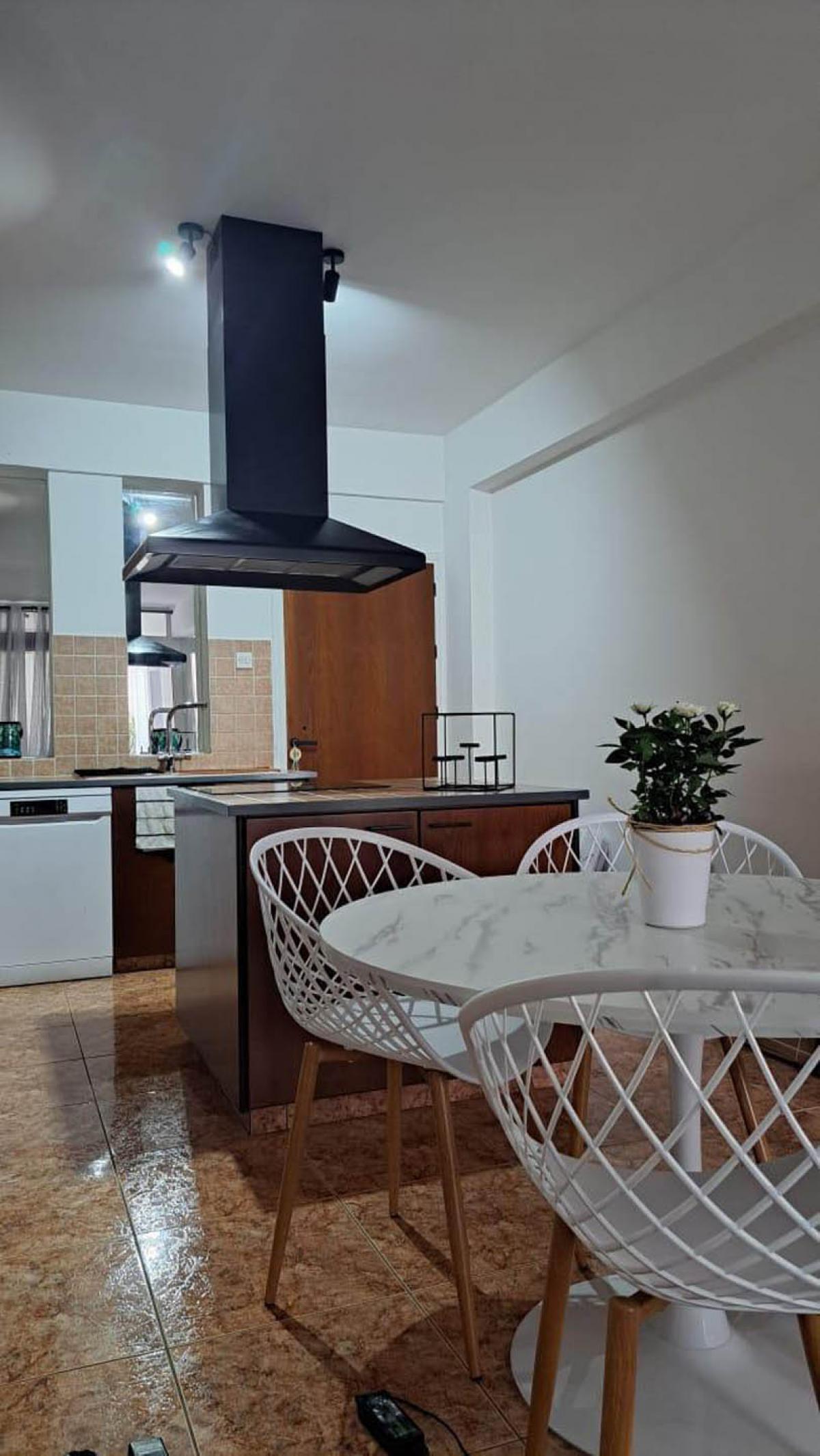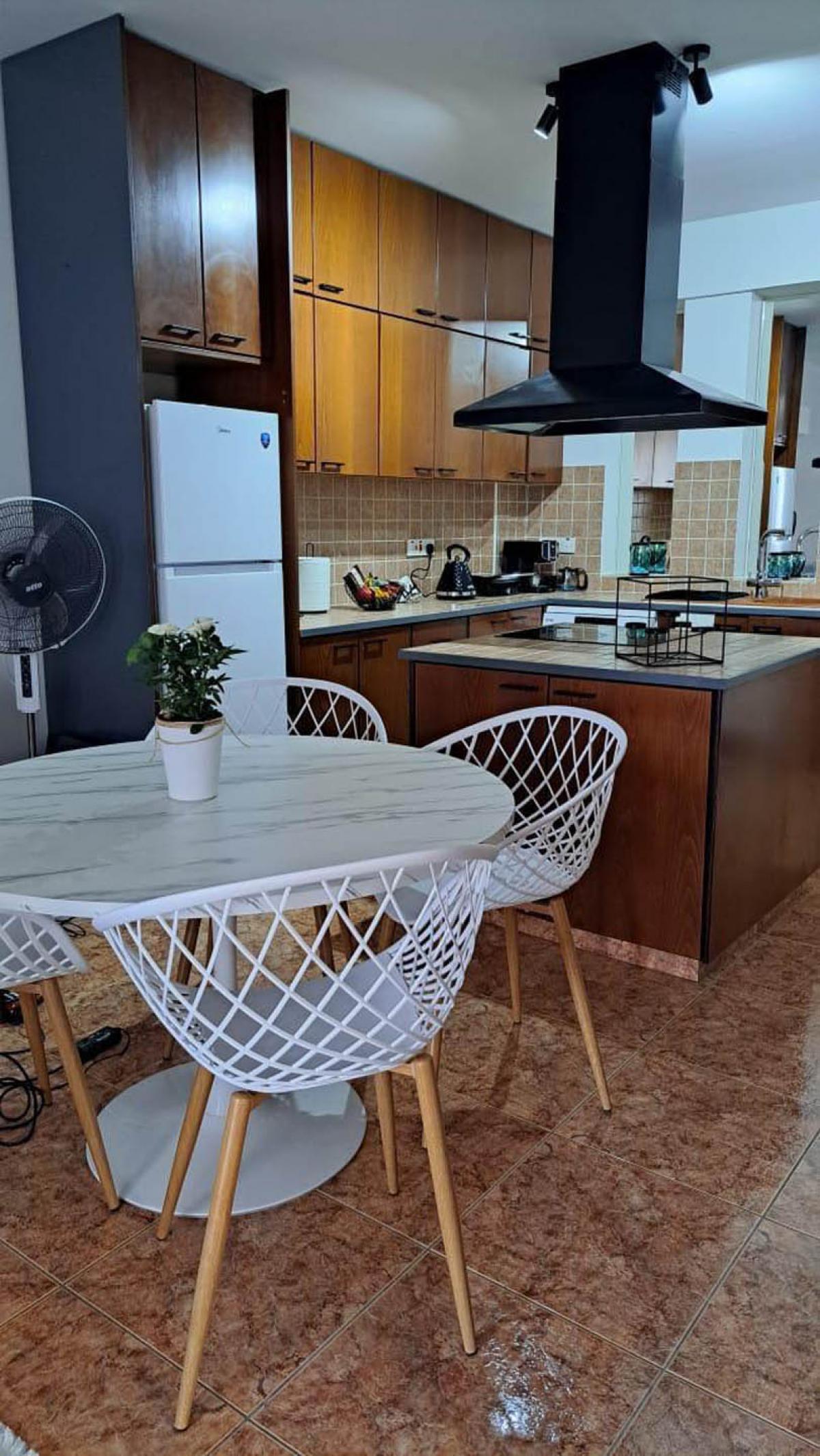 The kitchen is a blend of style and function. Marble surfaces, a sleek extractor hood, and designer chairs hint at modern tastes, while practical ceramic tile flooring adds durability and ease. Contemporary appliances sit side by side with classic cabinetry, and a cozy dining nook with a round marble table and woven white chairs evokes the gentle rhythm of Mediterranean life.