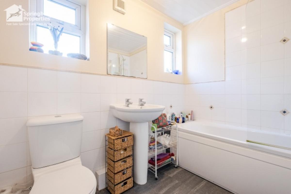 Upstairs, the property comprises two well-proportioned bedrooms, each providing a peaceful retreat. The bathroom is neatly laid out, fitted with a three-piece suite including a panelled bath with overhead shower, pedestal sink and WC.