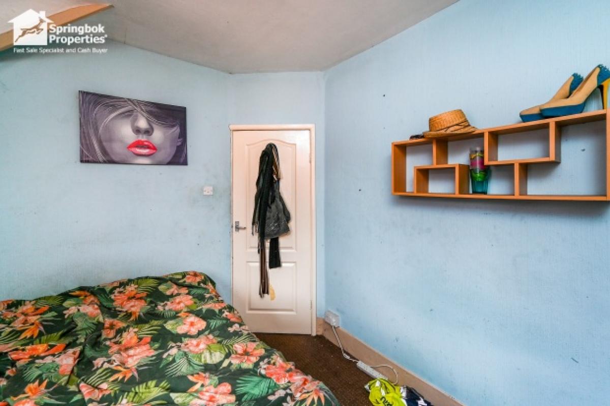 The first floor offers three proportioned rooms and a family bathroom. Outside, the rear garden provides private outdoor space with a lawned section and boundary fencing. A paved front allows for off-street parking.