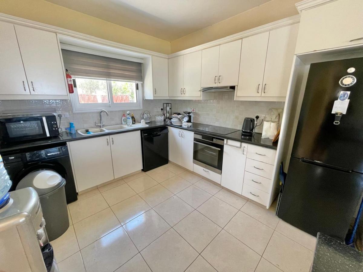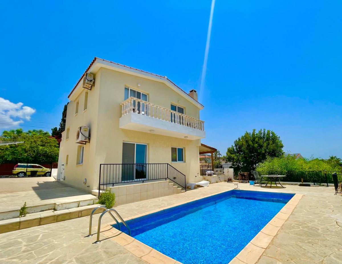 Designed in a traditional Cypriot style, the villa features a light-colored facade, elegant balconies, and arched doorways that create an airy and spacious feel. The use of natural materials seamlessly blends the home with its surroundings, while the well-maintained garden with palm trees and lush greenery adds to the sense of tranquility. The entire property is securely enclosed, ensuring complete privacy, while the spacious outdoor areas invite you to enjoy the island's year-round sunshine.