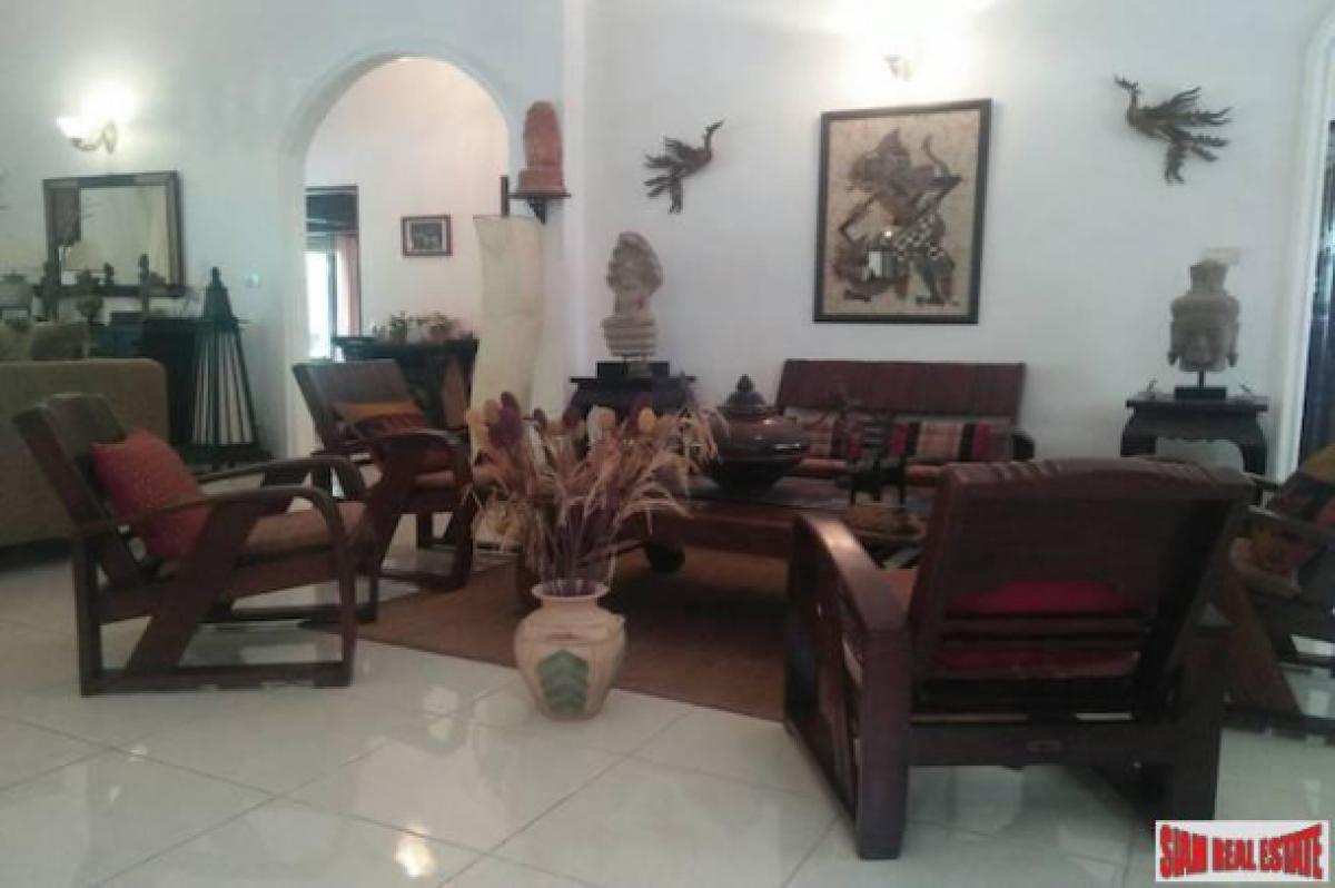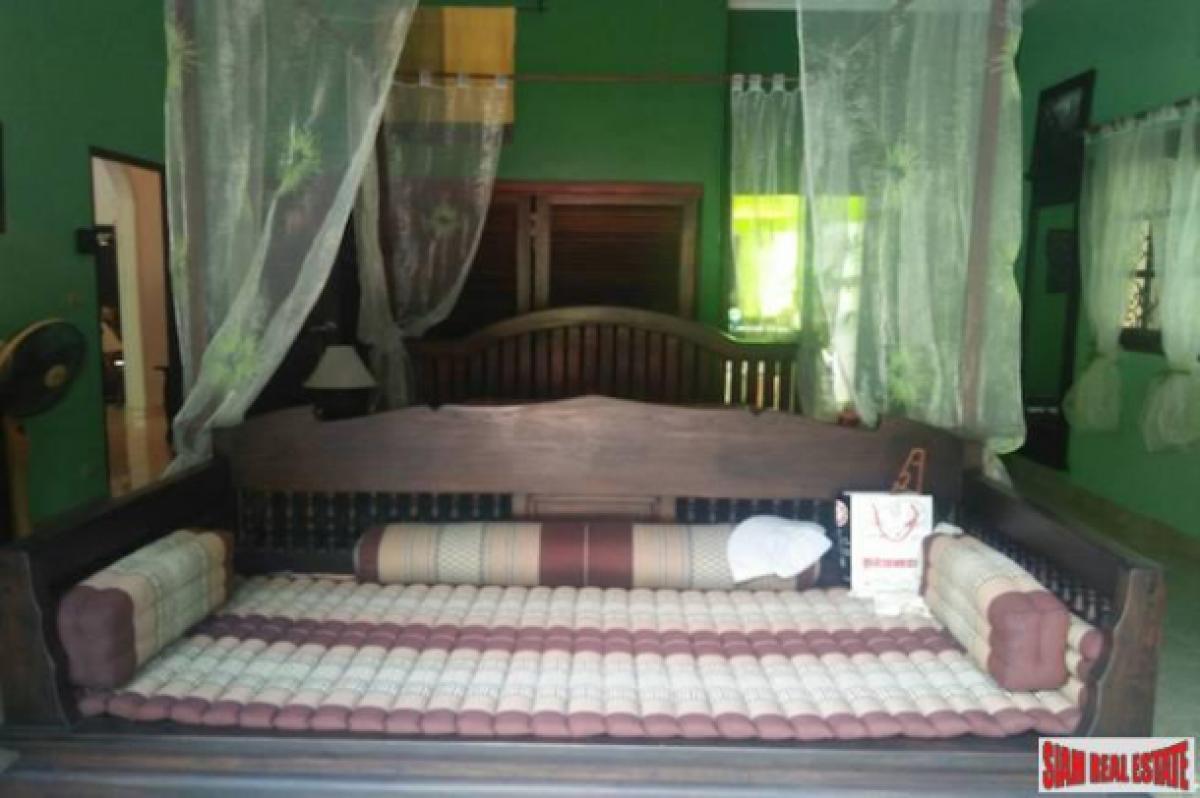 This is a lovely garden house in the suburbs surrounded by beautiful mountains and nature. A true green zone living space. The home has three bedrooms, all with ensuite bathrooms, a fourth guest bathroom and a maids room. The living space is a generous 450 sqm, while the land size is 5,668 sqm of tropical living and a fruit plantation.All rooms are spacious with big open windows and ceiling fans to enjoy the breezes. The home is also air conditioned. There is a large living room, dining area and Thai-style kitchen. The kitchen is situated on a corner and has windows on two sides for natural sunlight. It also has an island-style work station.