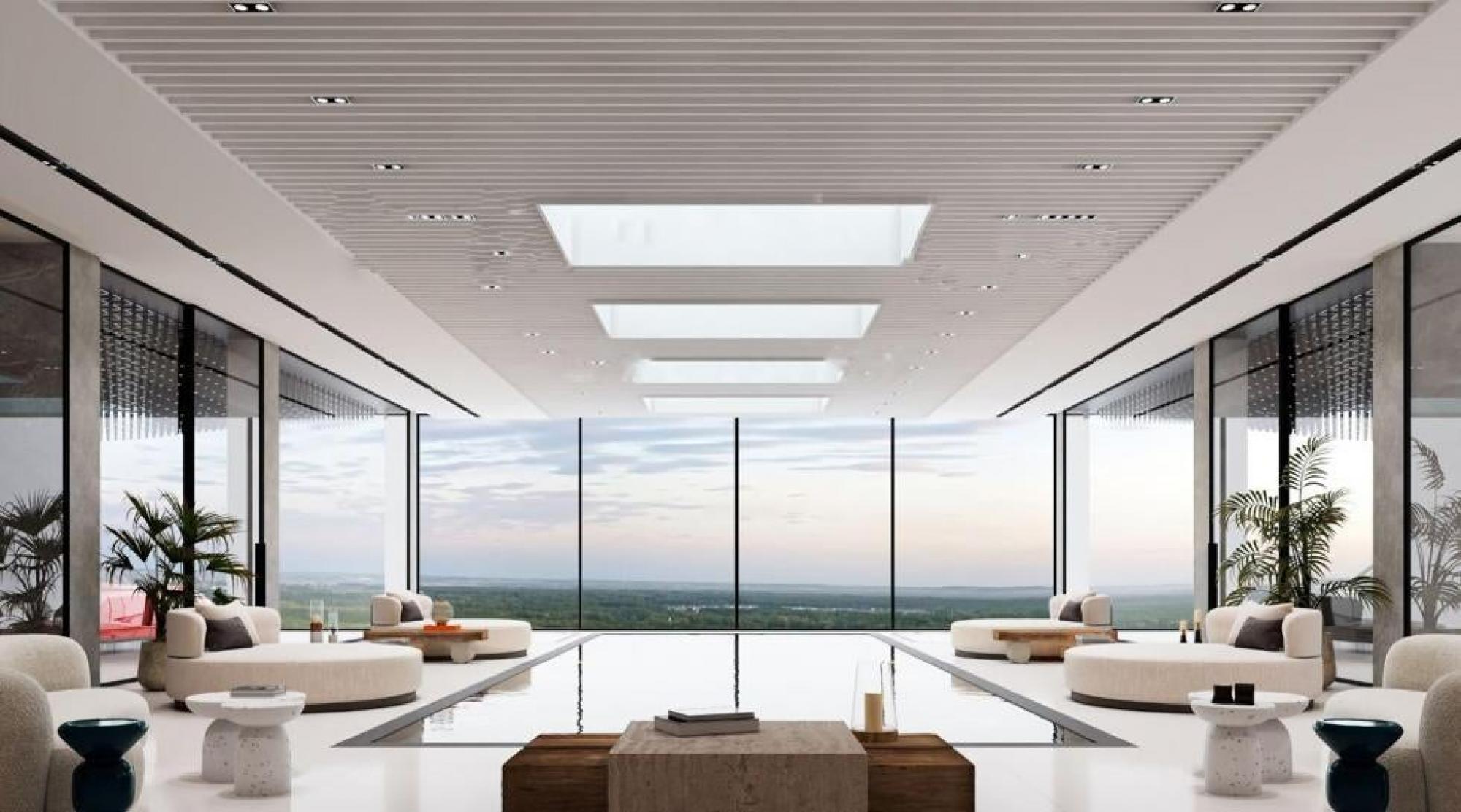 This unique villa offers three floors of grand living, featuring 16 bedrooms and 20 bathrooms, as well as every luxury amenity you could ever wish for: indoor and outdoor pools, wellness areas, cinema, entertainment spaces and a 15-car garage with a racing memorabilia showroom.