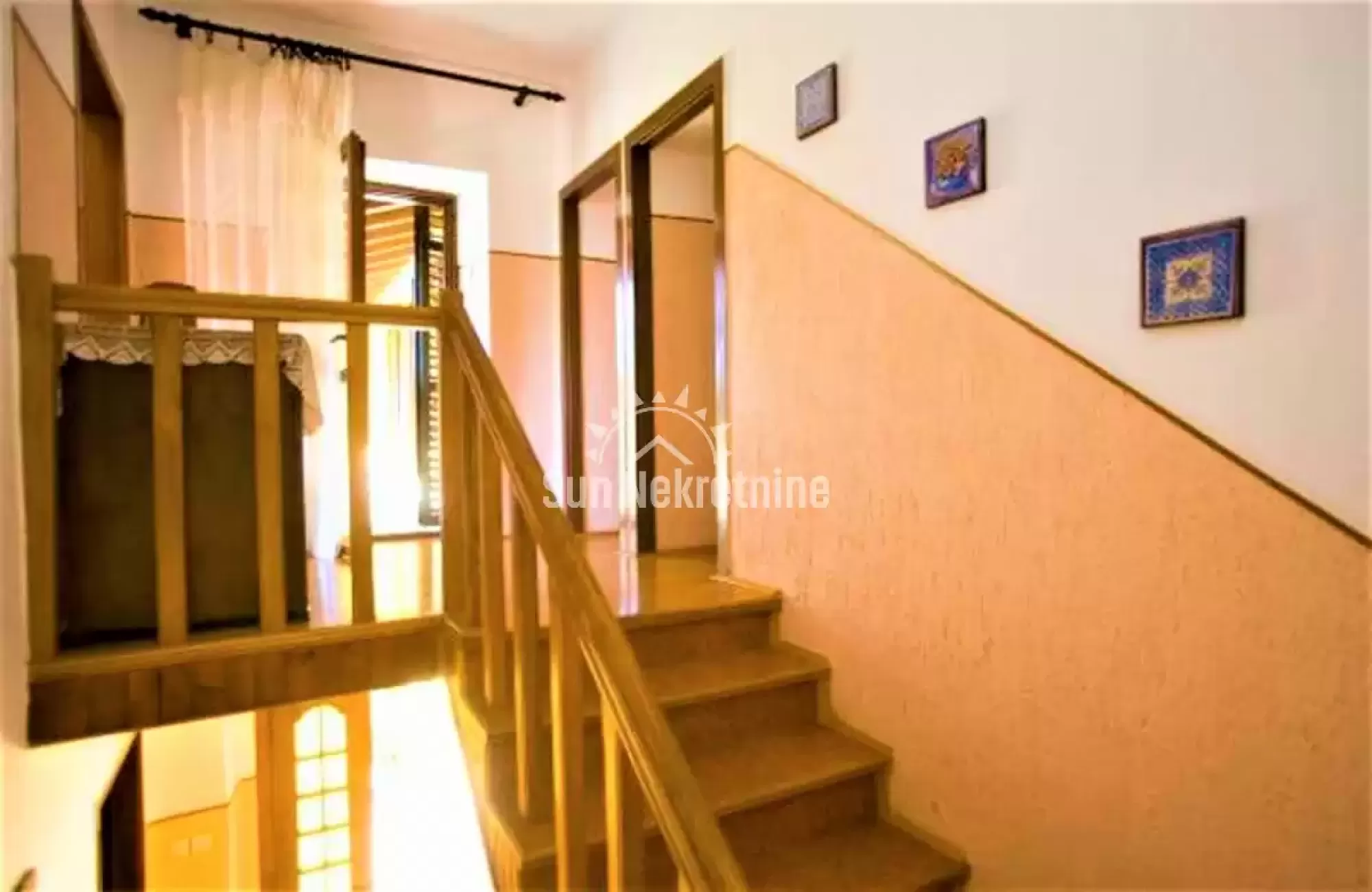 We offer a traditional Istrian stone house 220 m2 in a row. It consists of two separate entrances. The ground floor has a kitchen with dining area, hallway, living room, bathroom and toilet. Internal stairs lead to the first floor, where there are two bedrooms, a large terrace, a bathroom and a small hallway that has access to the pool. The price includes antique wooden furniture. In the second part on the ground floor there is a bedroom. Upstairs there is a traditional Istrian fireplace with kitchen, bathroom and a small hallway with access to the pool. Each bedroom has its own air conditioning, and central heating is installed on heating oil. There is a sundeck by the pool. The pool is fenced with a wooden fence for complete privacy. Below the pool is a playroom. Within the house on a plot of 320 m2 there is a 45 m2 auxiliary building, which should be renovated. In front of the house there are two parking spaces. Ideal property for lovers of rural peace.