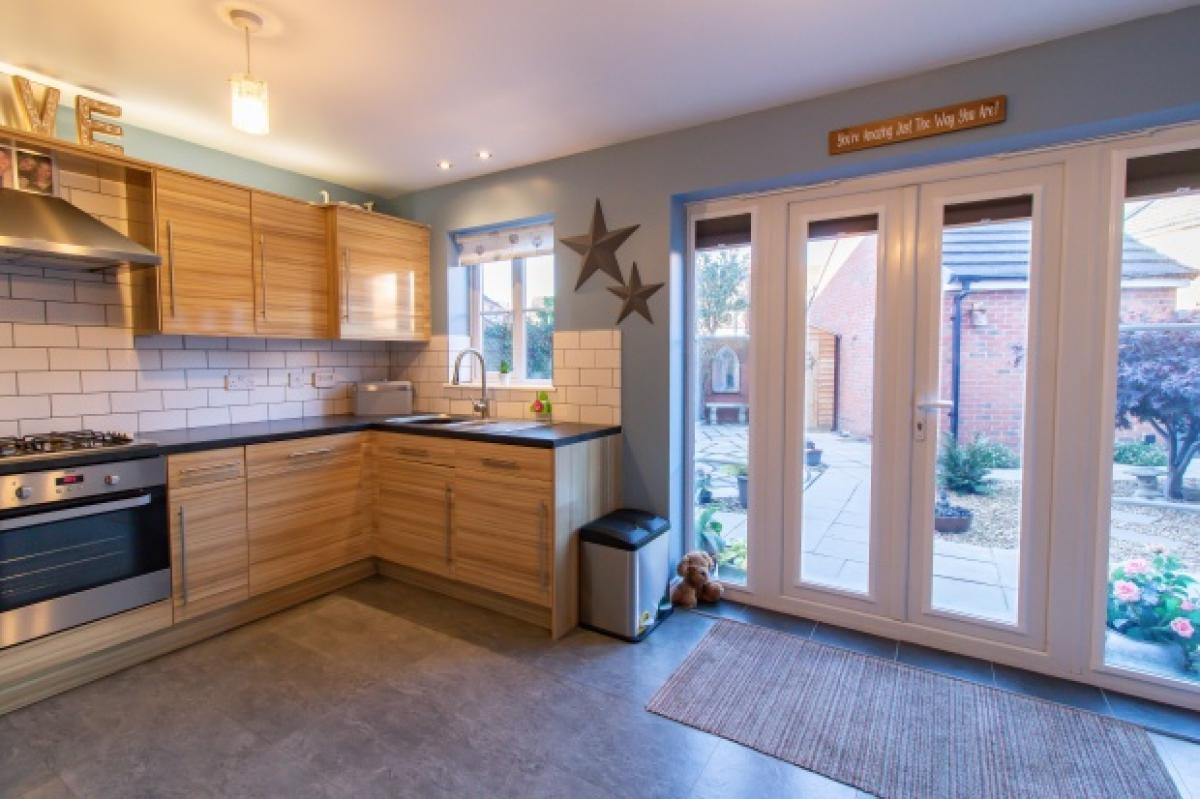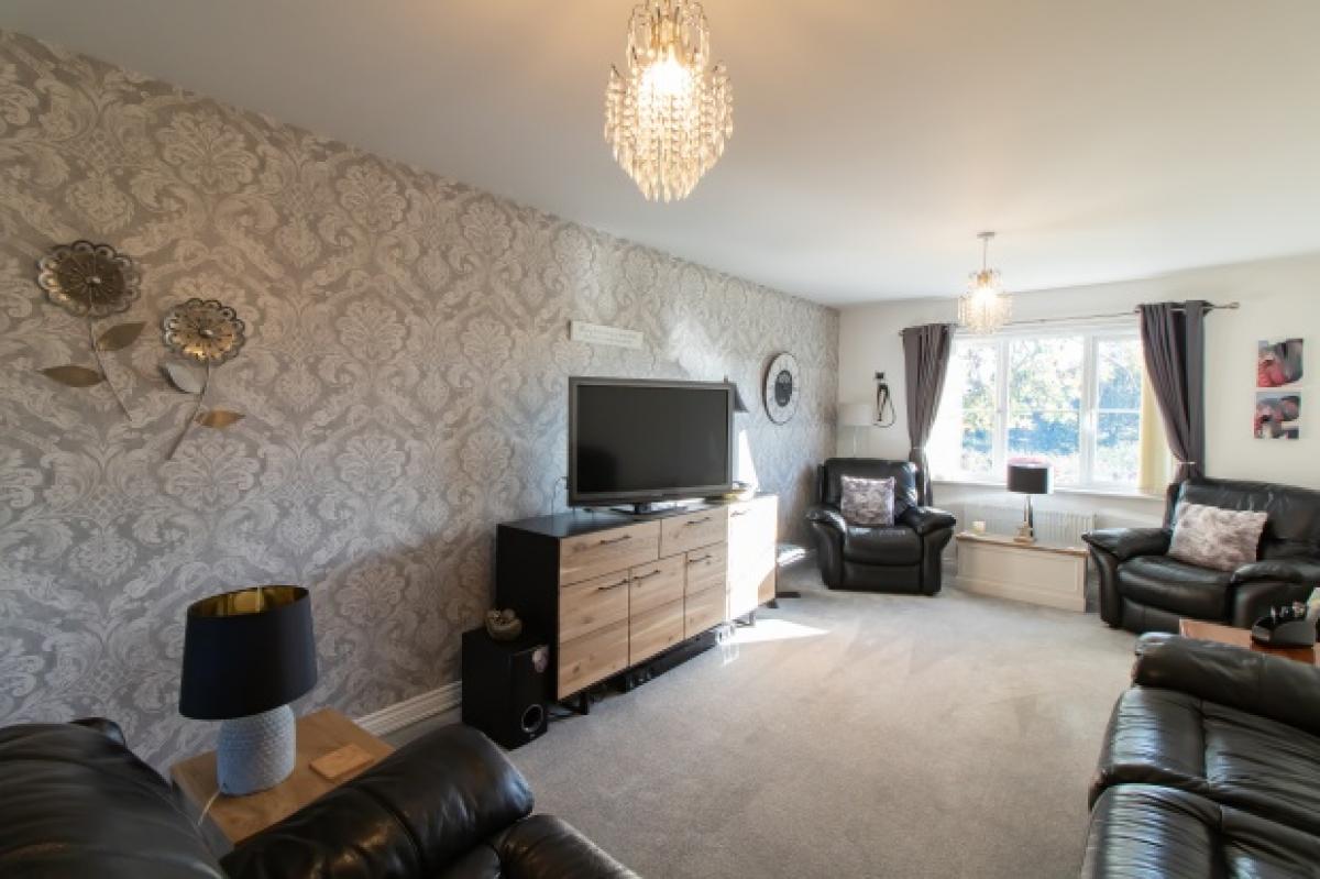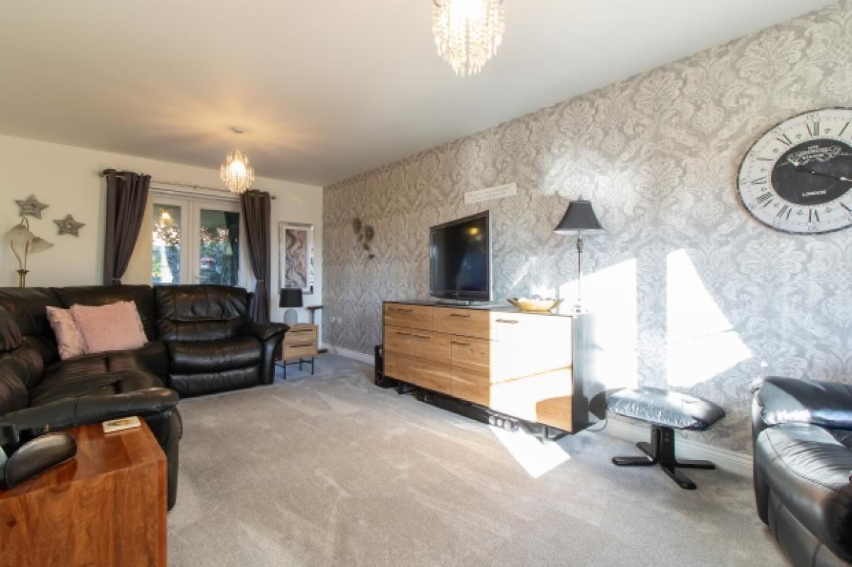 The interior is well presented throughout, featuring a bright entrance hallway leading to two reception rooms, including a full-length lounge with patio doors opening to the garden. The kitchen/breakfast room provides a sociable family space, fitted with modern units, integrated appliances, and room for dining. There is also a convenient ground floor WC.