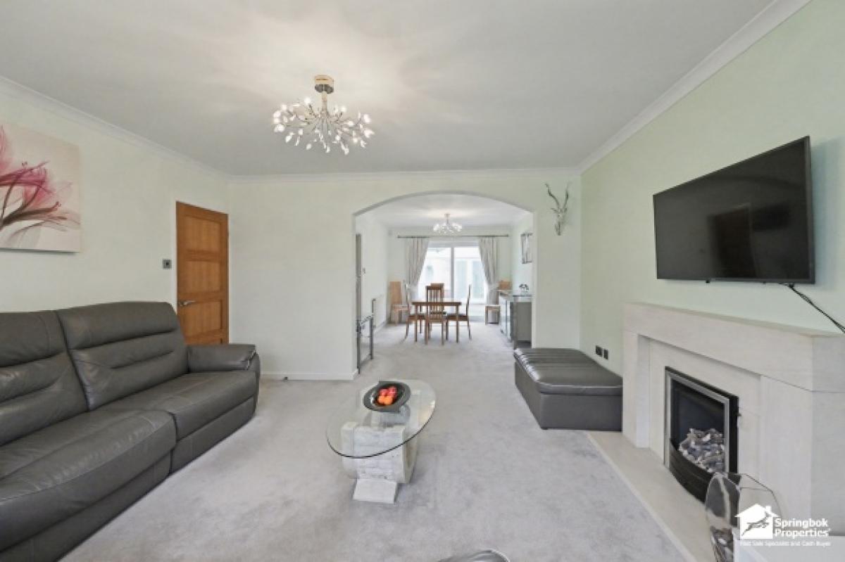 Inside, a bay-fronted lounge leads seamlessly through a cased opening into the dining room, forming a natural flow for informal and formal occasions. The kitchen and adjoining utility room provide direct side-garden access, ideal for family routines and practicality.