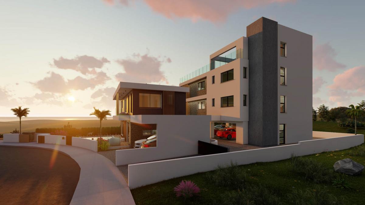 This stylish and modern complex was designed specifically for a prime plot in Ypsonas, where the four-bedroom villa takes center stage as the true jewel of the project. Surrounded by an apartment block, the villa sets the tone for the entire architectural design with its elegant lines, panoramic views of the mountain ranges, and the endless Mediterranean Sea. Contemporary architectural solutions create harmony between the villa's privacy and the coziness of the surrounding apartments, making it the dominant feature of the complex. It perfectly balances classic lines with modern elements while preserving a sense of exclusivity and intimacy.