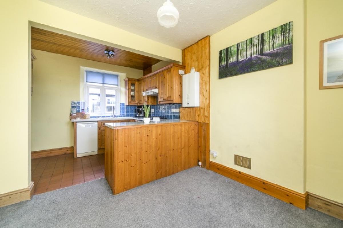 * Kitchen/diner with wooden units and marble-effect work surfaces