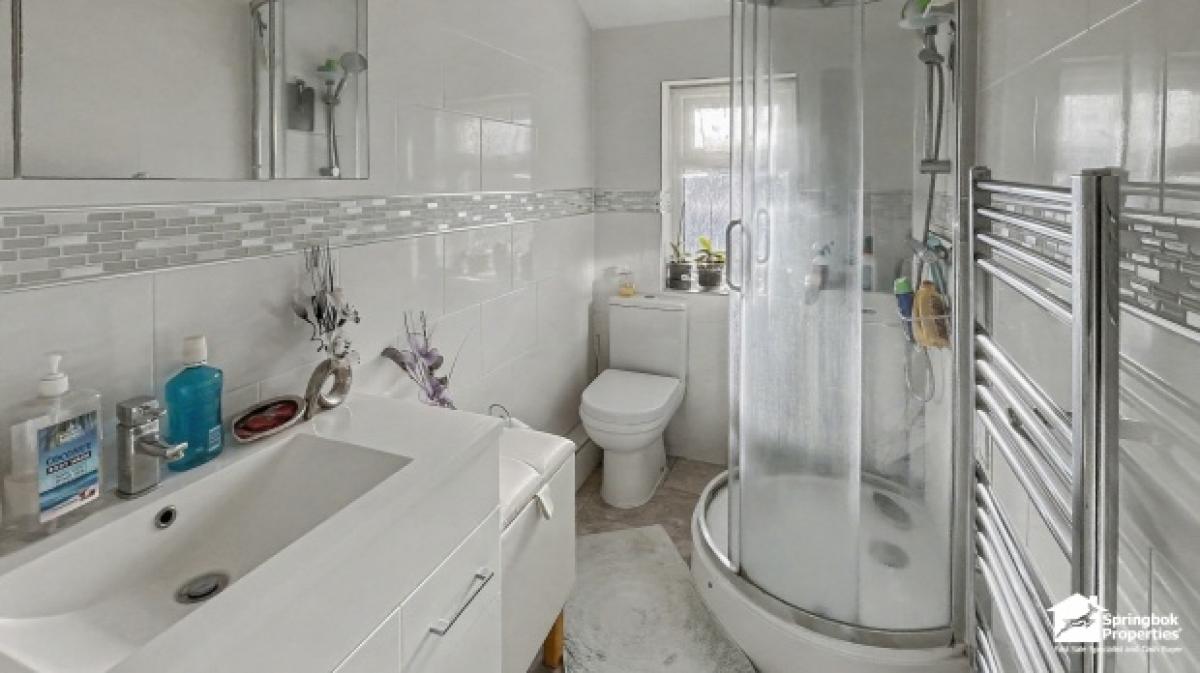 Upstairs, you'll find two bedrooms. The front-facing principal bedroom features a large bay window and built-in storage potential, while the rear double bedroom overlooks the garden. A sleek, fully tiled family shower room completes the upper level, fitted with a corner shower, vanity basin, WC and heated towel rail.