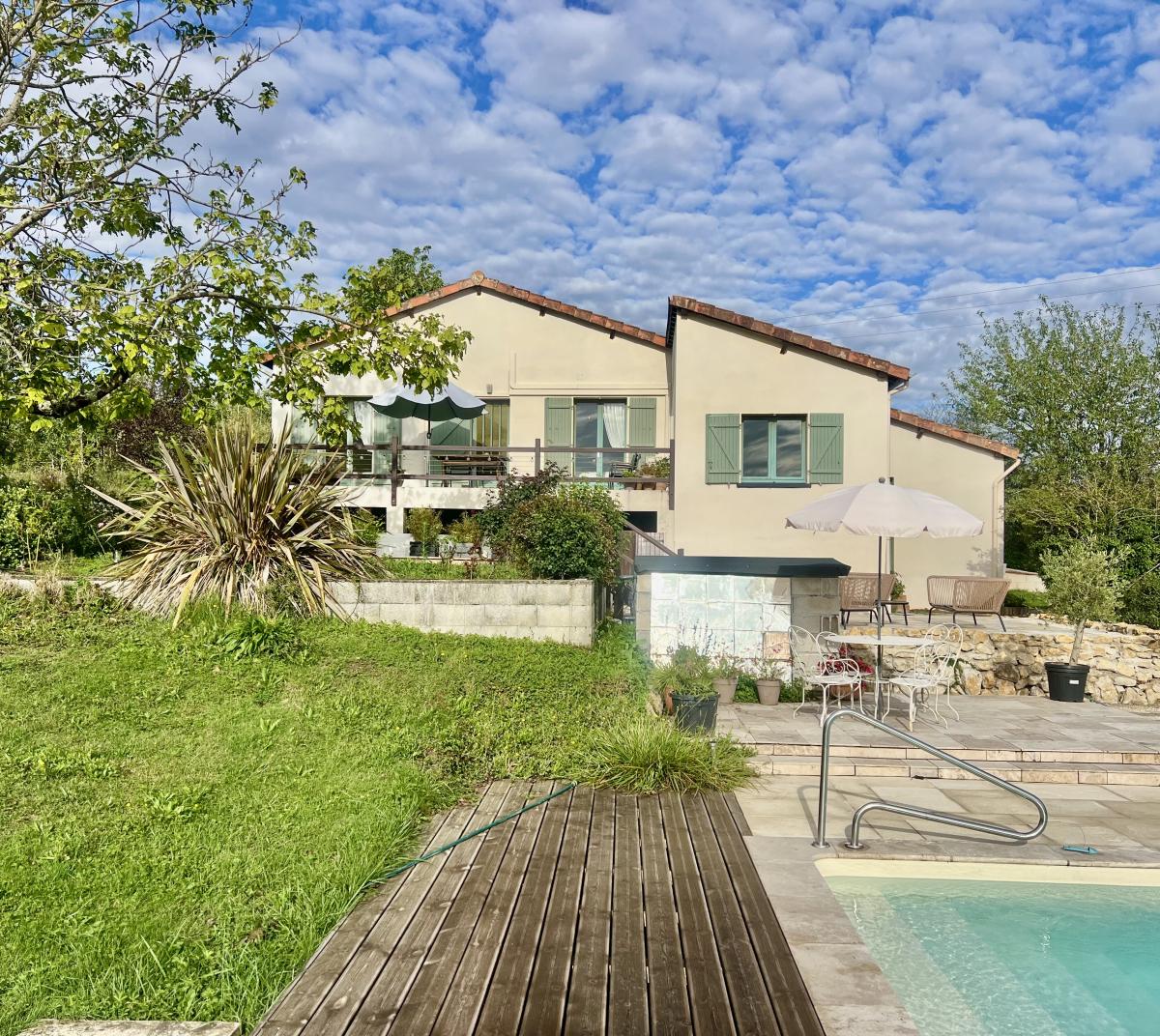 in Monpazier, in a quiet setting with unobstructed views of the countryside, this pleasant single-storey house with approximately 130 m2 of living space offers a peaceful lifestyle on 4,679 m2 of wooded grounds. it comprises an entrance hall leading to a beautiful, bright living room with an open-plan kitchen and dining area and a cosy lounge with a wood-burning stove. A corridor leads to a shower room with WC, a separate WC, a storeroom used as a laundry room, a bedroom and a master bedroom with en-suite shower room and WC. The terrace on stilts offers a beautiful view of the garden and the swimming pool (heated, saltwater, 10m x 5m). A separate studio of approximately 22 m2 located in the extension of the house consists of a room with a sink and WC as well as a separate bedroom, ideal for accommodating family and friends or for rental use. A garage completes the property and provides sheltered parking for one vehicle. Located just a few minutes from a village ranked among the most beautiful in France, this property is ideal as a main residence, holiday home or tourist project.