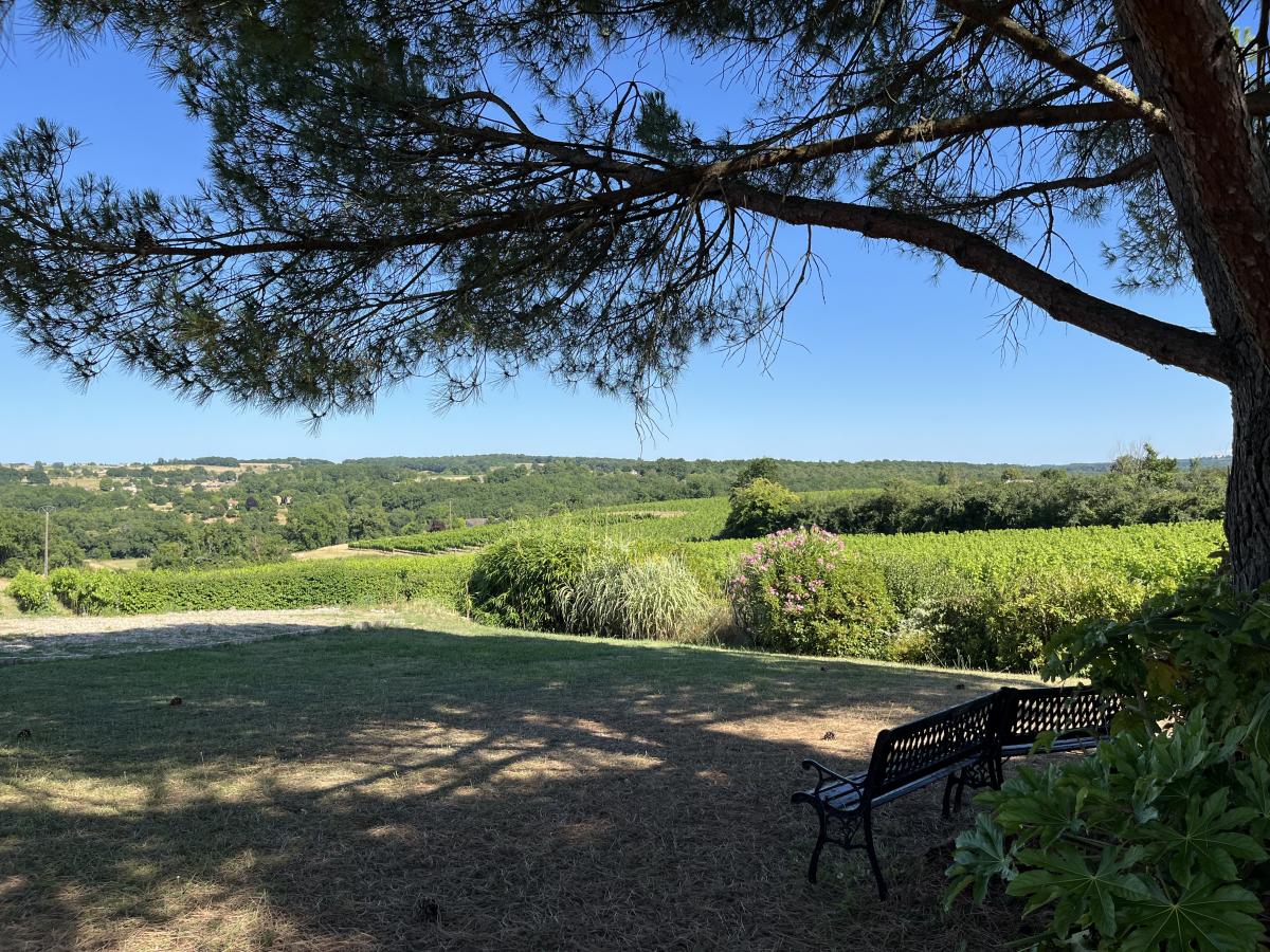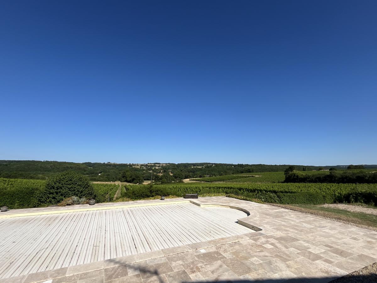 Character property between Bergerac and Saint-Emilion: Beautiful Gironde style white stone building with panoramic views of the countryside and vineyards (Bordeaux Superieurs and Cremant de Bordeaux appellation), offering 9 bedrooms and 7 bathrooms, 3 living rooms, two kitchens and a beautiful terrace. Carefully renovated over the years, it can become a main or secondary residence, and has seasonal rental potential with its two independent parts.Easy-maintenance 3300m3 garden with beautiful trees (including two umbrella pines) and a heated 11.5m x 5.5m swimming pool.