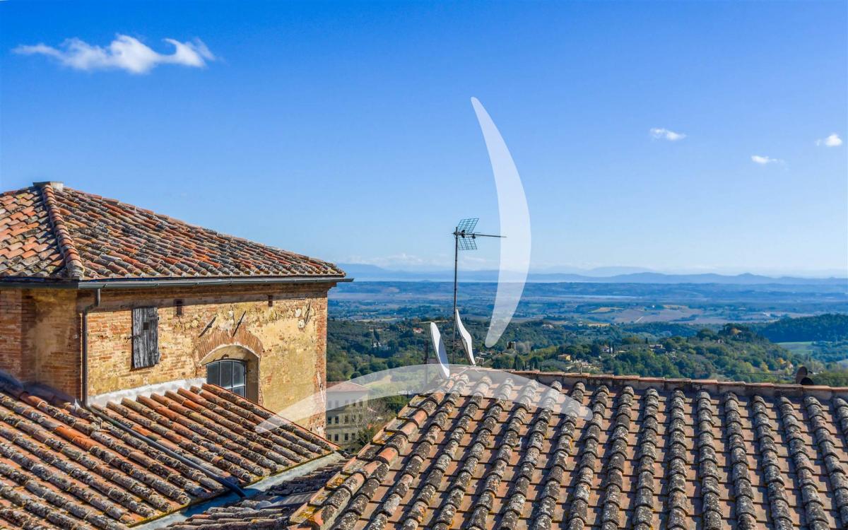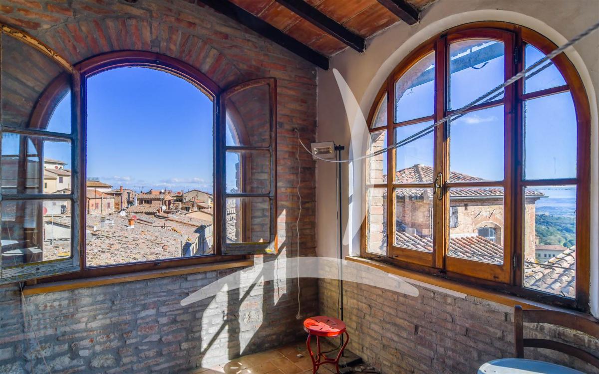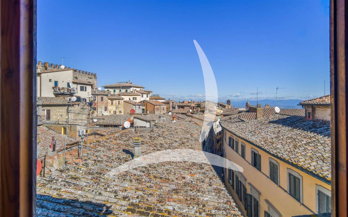 The property, free on three sides and distributed over four floors, preserves its original structure and details: high ceilings with wooden beams, arched hallways, and bright rooms overlooking the rooftops and rolling hills of the Val di Chiana.