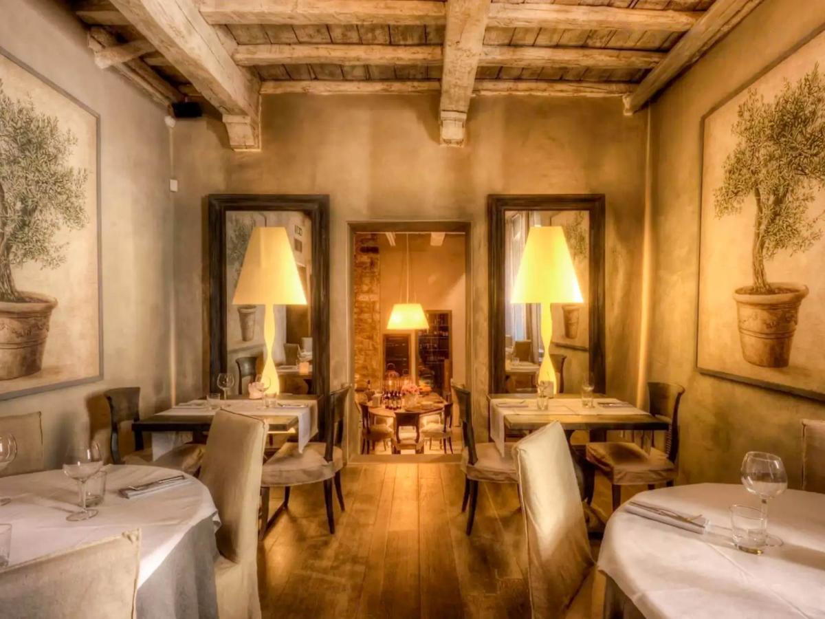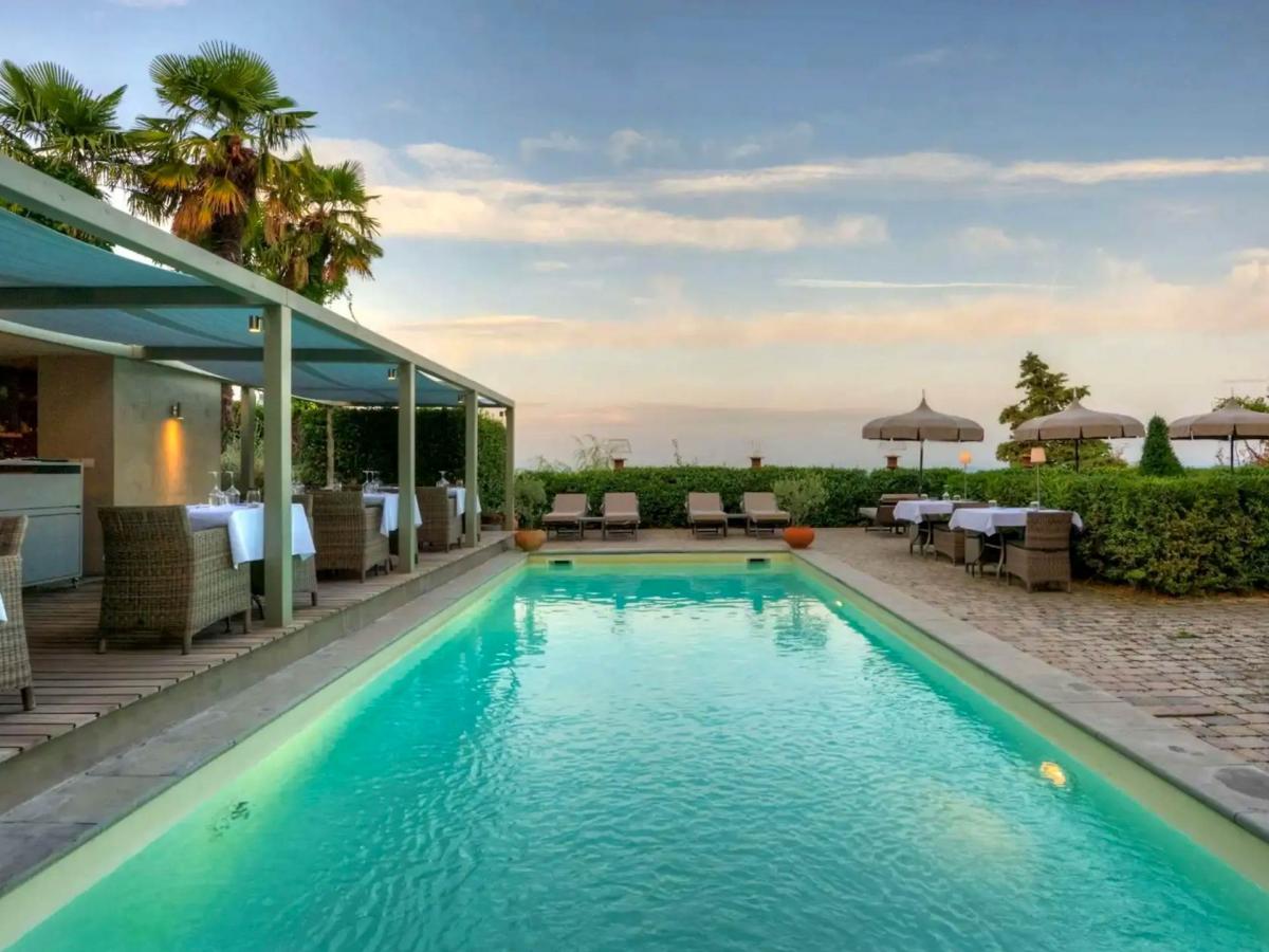 The main building houses the reception and an elegant restaurant that opens onto a spacious panoramic terrace—perfect for outdoor breakfasts, aperitifs, and sunset dinners, with views over the outdoor pool and the surrounding hills. Guests can relax in the meticulously maintained italian garden, with roses, aromatic plants, and shaded lounge areas with sofas and atmospheric lighting.
