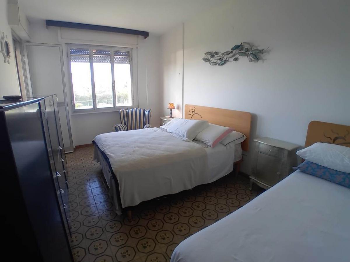 The property is spread over multiple levels: the raised ground floor hosts a welcoming living room with access to a livable terrace—perfect for al fresco dining—and a practical kitchenette. The first floor features two double bedrooms, one with a private balcony, and a windowed bathroom. The second floor is dedicated to the master bedroom with an en-suite bathroom and direct access to a stunning panoramic terrace boasting sea and Apuan Alps views, currently arranged as an outdoor dining area and small fitness zone.