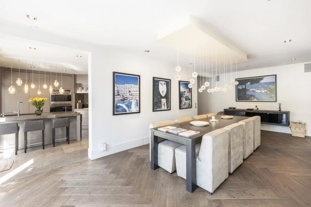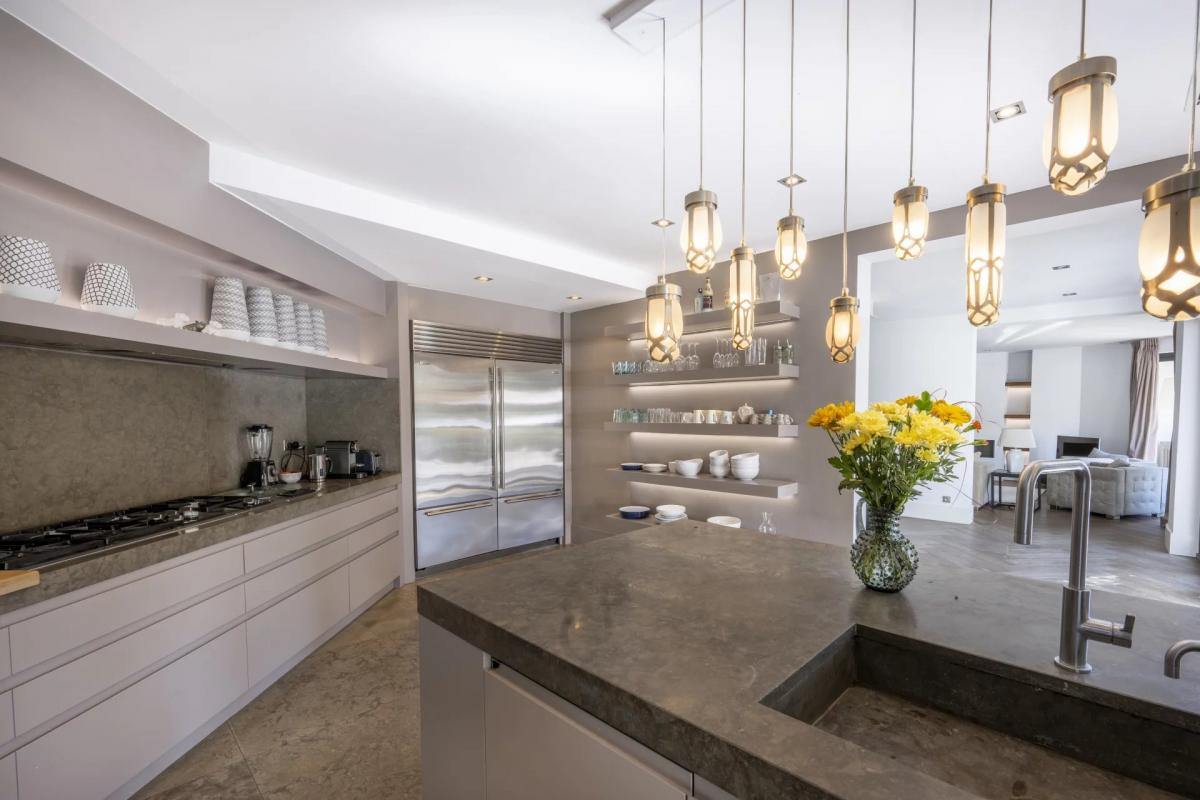 The ground floor features a high-end kitchen with marble and stone countertops, quality appliances, and a breakfast area. The dining room with gas fireplace opens to a bright living room.