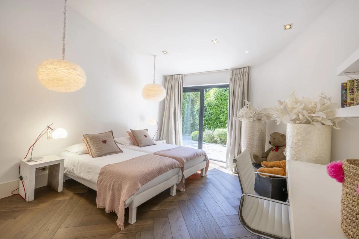 All main rooms open directly onto sunny terraces, outdoor lounge areas, and a heated pool. The poolhouse includes a summer kitchen, shower, and toilet.
