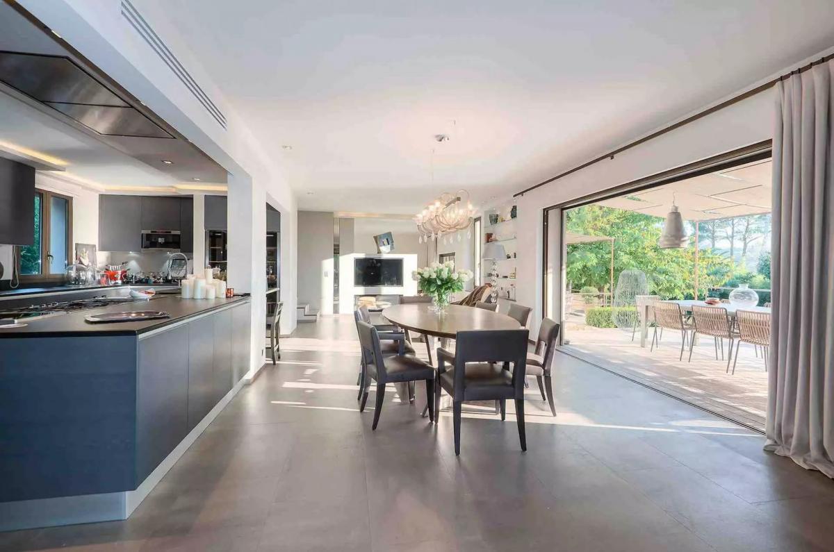 Outdoors, a swimming pool blends seamlessly into the garden, perfect for enjoying the Riviera lifestyle.