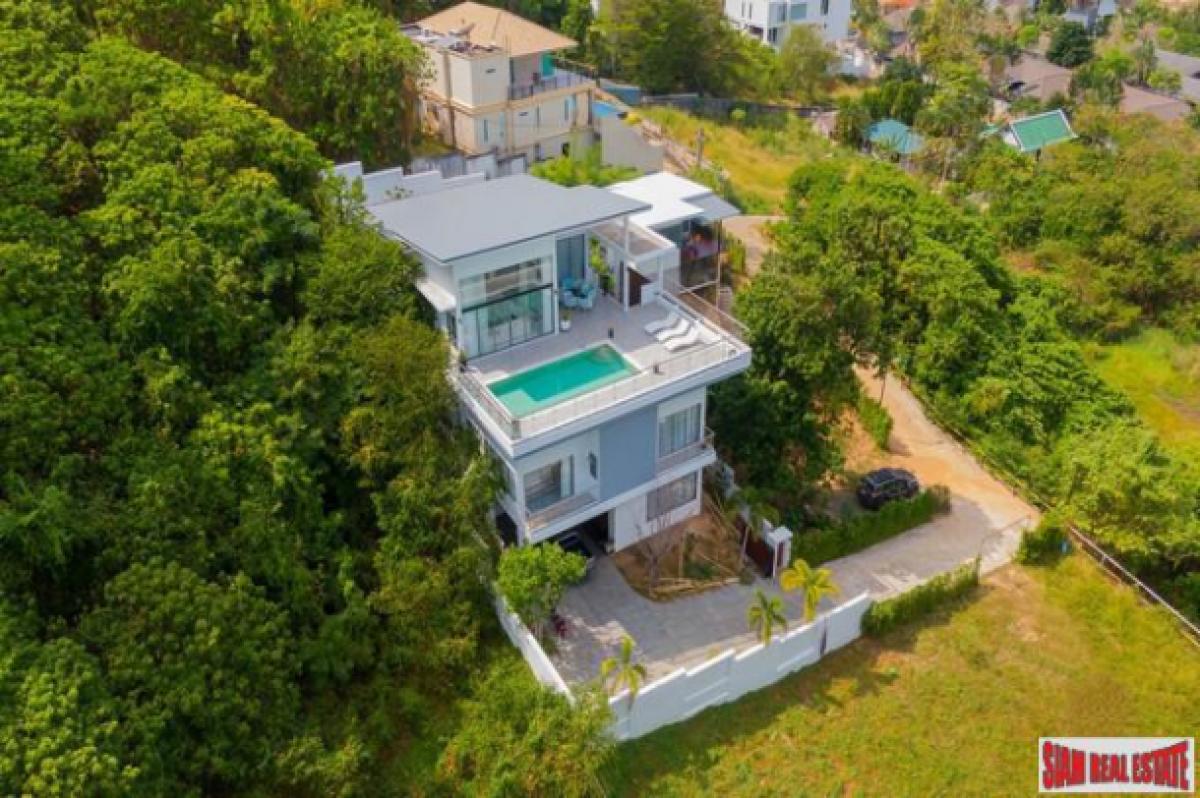 Welcome to a modern pool villa in close proximity to Naiharn Beach, just a 5-minute drive away, surrounded by lush tropical nature. This spacious three-story villa offers an exceptional rooftop pool and numerous terraces that provide stunning views of the mountains. The villa is a showcase of open, naturally lit modern design, complemented by high-quality furnishings.Situated on a 620 sq.m. inclined land, the villa also features an additional 976 sq.m. flat land in front, resulting in a total property land area of 1,596 sq.m. The highest floor stands out as the focal point, hosting master bedrooms with ensuite baths, offering a picturesque swimming pool and nature views. A modern, Western-designed kitchen, complete with a luxurious 8-seater dining table, seamlessly connects to the open and naturally lit modern living room. This level provides direct access to the rooftop pool, featuring a spacious terrace and outdoor seating areas.