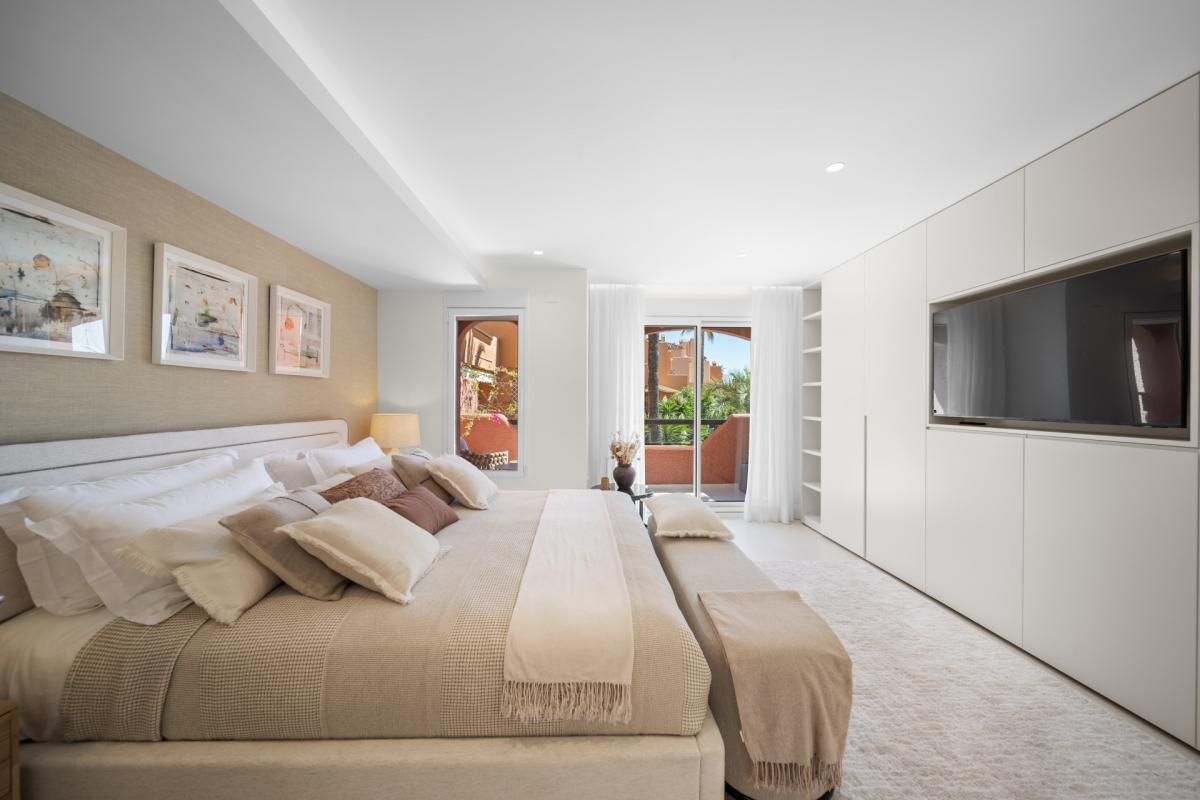 This luxurious turnkey residence is located within the highly reputable development of El Palmeral in Nueva Andaluca. Fully renovated to exceptional standards, the townhouse showcases premium finishes and refined dcor throughout, featuring thoughtfully designed interiors, designer furnishings, and elegant contemporary touches.Upon entering, you are welcomed into an open-plan kitchen, dining, and living area that immediately reflects the impeccable taste found in every corner of the home. The modern Santos kitchen is both stylish and functional, perfect for everyday living and entertaining alike. The spacious living area, enhanced by a cosy Planika fireplace, flows seamlessly onto a covered terrace equipped with double glazing, electric shutters, and awningsall controlled via a smart-home system to ensure maximum comfort and convenience. A guest toilet completes this level.The first floor hosts two generous bedrooms, each with its own en-suite bathroom. One of the bedrooms also enjoys a private terrace, offering comfort, privacy, and charming views.The top floor is dedicated entirely to the master suite, featuring two private terracesone accessed directly from the bedroom and the other from the landingideal for sunbathing, relaxation, or al-fresco dining.Residents of El Palmeral enjoy exceptional community amenities, including a swimming pool, jacuzzi, sauna, and gym, all surrounded by beautifully landscaped gardens. The gated community also provides surveillance cameras and an advanced alarm system for enhanced security. For added convenience, a dedicated laundry area is located on the first floor. The property is sold fully furnished and includes a private garage with space for a large car.Perfectly positioned within walking distance of tennis and padel clubs, restaurants, shops, a supermarket, and the prestigious Aloha and Las Brisas golf courseswith Aloha College just a 5-minute drive awaythis home is ideal for those seeking to embrace the vibrant local gastronomy and the healthy, outdoor lifestyle that the Costa del Sol is famous for. Whether for year-round living or as an exclusive holiday retreat, this recently refurbished residence offers an unparalleled blend of luxury, convenience, and Mediterranean charm.