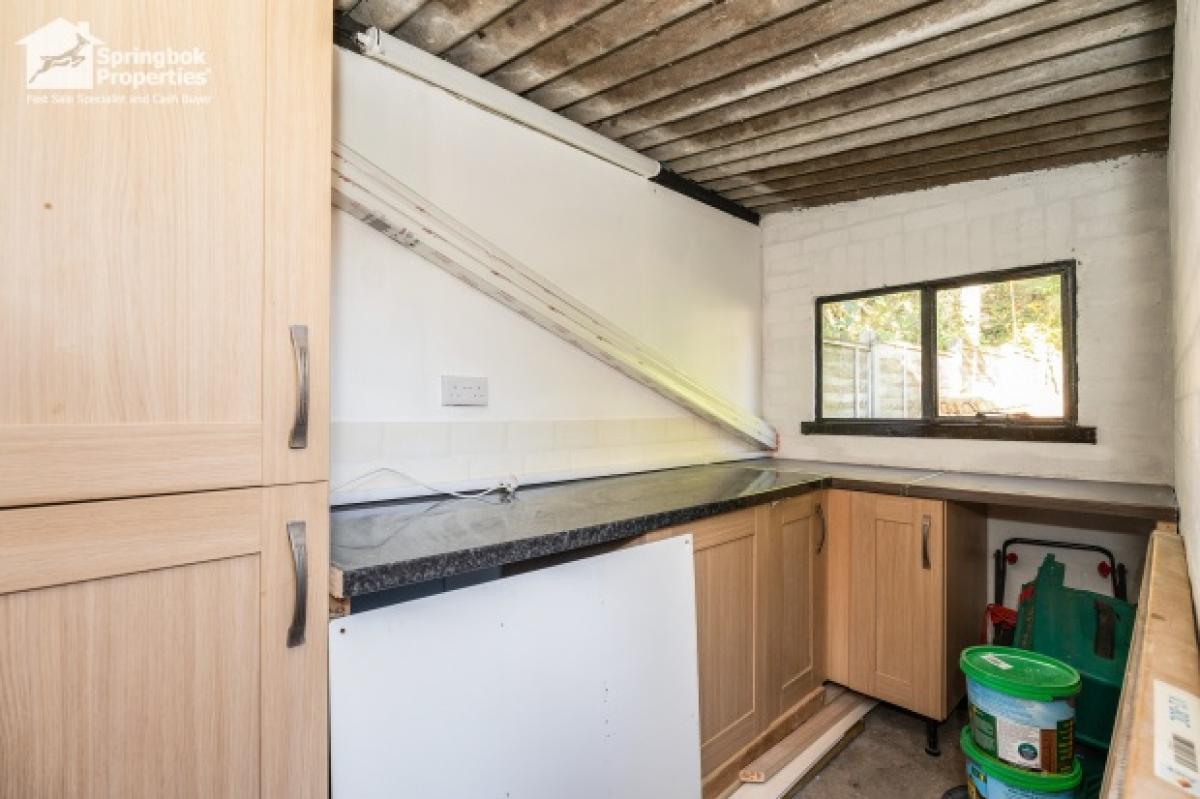 The kitchen features fitted cabinetry, tiled splashbacks and space for appliances, while the adjoining utility outbuilding provides useful additional storage and work surfaces, ideal for hobbies or practical household use.