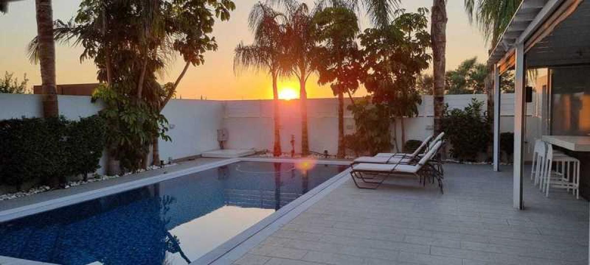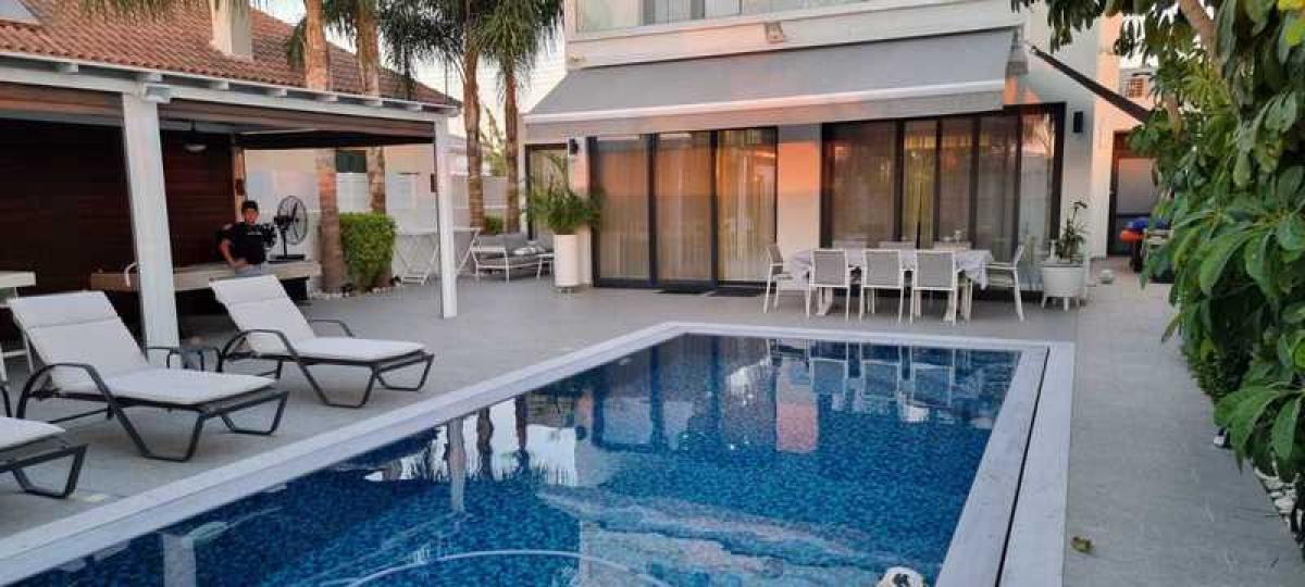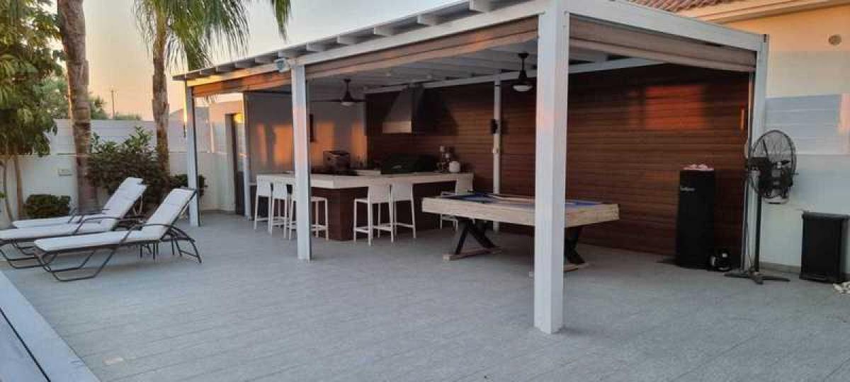 Reference ID: #SA31823Price details: €985,000Luxurious modern design, semi-detached villa in Oroklini, Larnaca. The villa was erected few years ago with luxurious finishes and consists of an open plan kitchen/ dining/ living area and a guest WC on the ground floor, four bedrooms (the master with ensuite) and a bathroom on the 1st floor. It also has another room on the 2nd floor with a roof garden. The garage on the ground floor has been converted into a 6th room/ cinema room.Externally there is a private swimming pool, BBQ area, shower, storage, verandas and a garden. The villa is fully furnished and equipped. Final approval has been obtained. No VAT.Reference number: SA31823