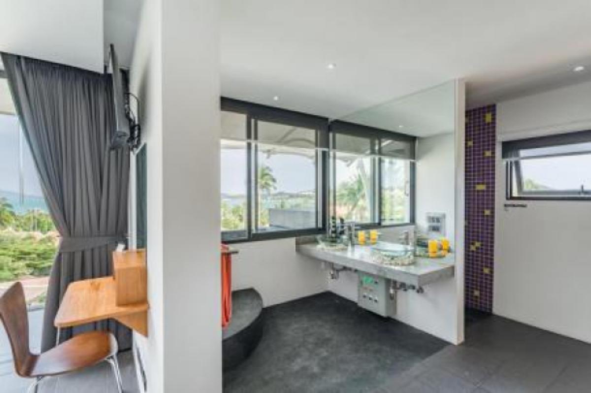 This extensive sea view villa is located in a picturesque and quiet area of Bangrak and boasts views of the sea and the neighbouring island of Koh Phangan and beyond. Walled in and set on 0,63 rai of land in landscaped tropical gardens, this modern Koh Samui property for sale offers all the comforts for a luxury life style and assures complete privacy.The impresive property is spread over 4 floors and has a separate pavilion in the garden.The ground floor can be accessed directly from the parking or through the garden and has a bedroom with ensuite bathroom and an outdoor but covered kitchen. This could be an ideal spot for live in staff.