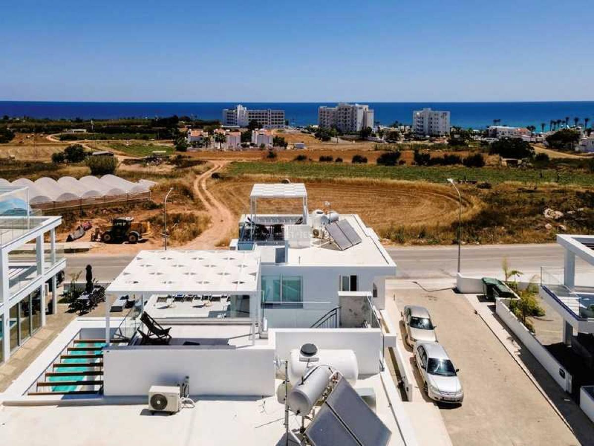 Stunning 4-bedroom villa with roof garden located in a prime location in cosmopolitan Protaras within few feet away from amenities and beautiful sandy beaches of Protaras.This amazing villa with plenty of natural light throughout ideal for people searching for a carefree vacation under the sun and stars features open plan kitchen, living/dining area that leads directly onto the outside pool terrace. Two bedrooms with built in wardrobes sharing one good size of a shower room completes the ground floor area. First floor, 2-spacious bedrooms with built in wardrobes each enjoys a shower room. Villa benefits from its private roof terrace with amazing sea views.