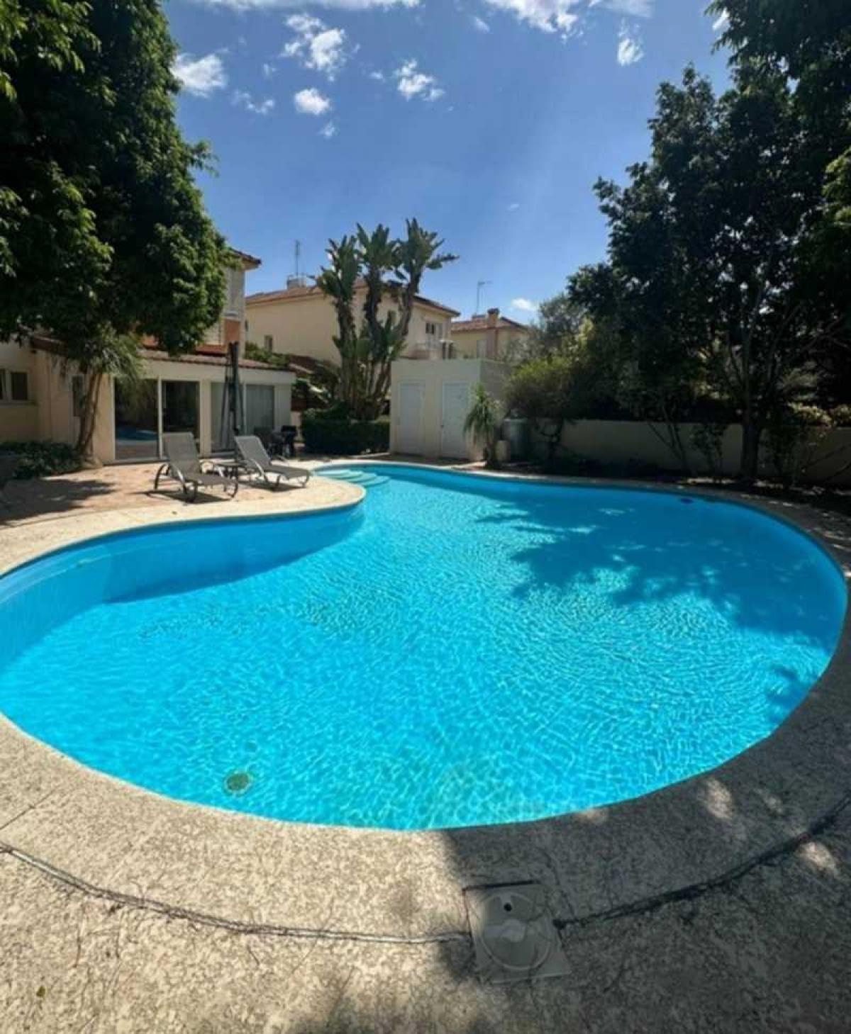On the outside there is a garden with mature trees and a large swimming pool.