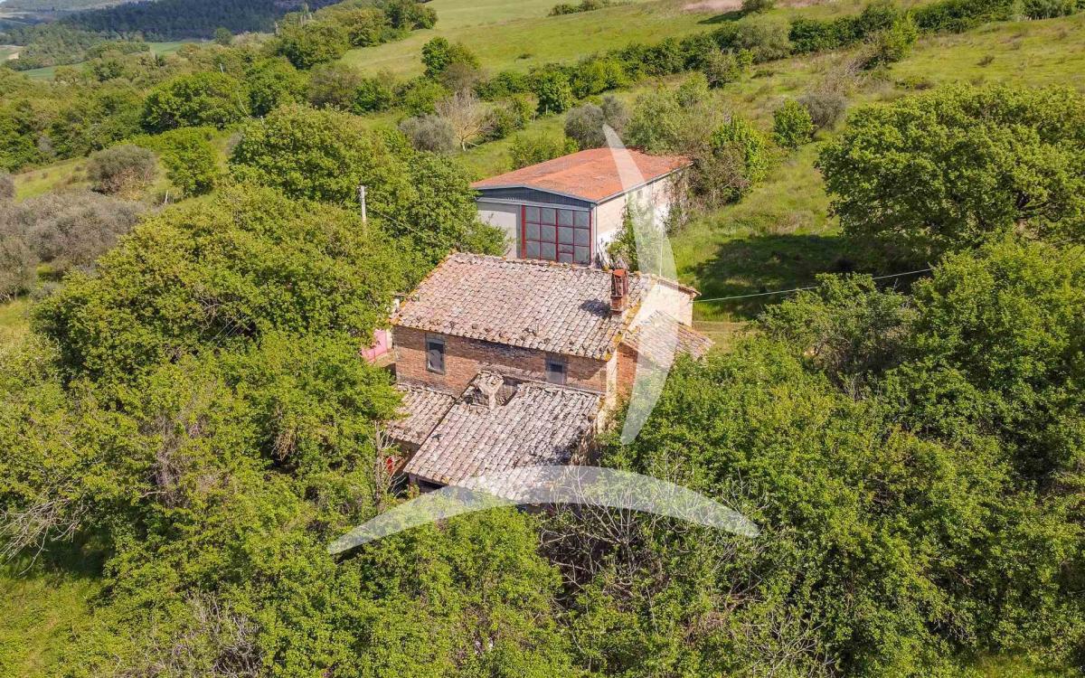 Set in a dominant position with sweeping views over the Val d'Orcia, the property includes additional structures such as a 250 sqm barn with conversion potential and a 25 sqm garage. The 7 hectares of surrounding land are divided into 5 hectares of arable land, 1 hectare of olive grove with vineyard rows, and 1 hectare of woodland. Water is supplied by a natural spring. Perfect for those looking to establish a rural residence or develop a hospitality project in the heart of Tuscany.