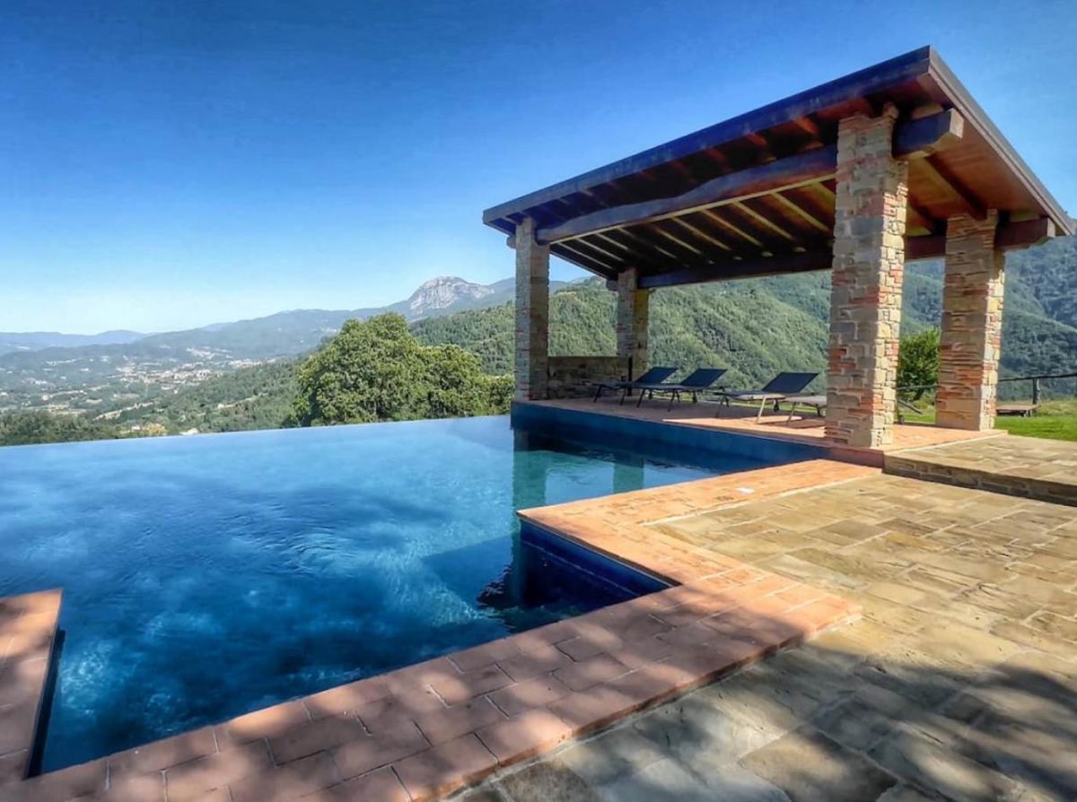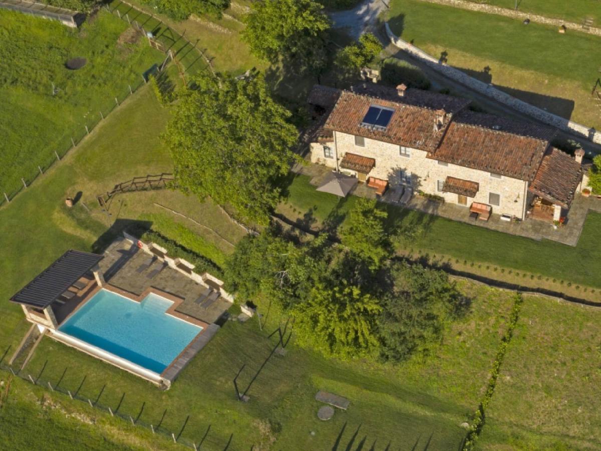 The farmhouse stands in a dominant position surrounded by approximately 8,700 sqm of private land, with an open and breathtaking view over the valley and the surrounding peaks. The outdoor spaces have been meticulously designed for wellness: a magnificent panoramic heated pool allows for extended seasonal use, accompanied by a jacuzzi and several relaxation areas equipped for socializing. The property is reachable via a well-maintained typical mountain road that guarantees maximum privacy. The well-kept garden and the silent context make this place a paradise for those seeking deep contact with nature and an authentic lifestyle.