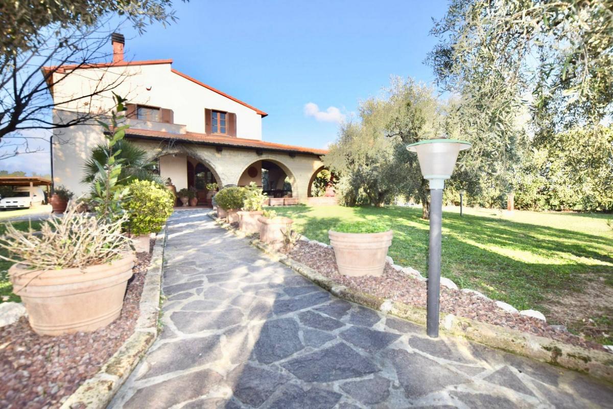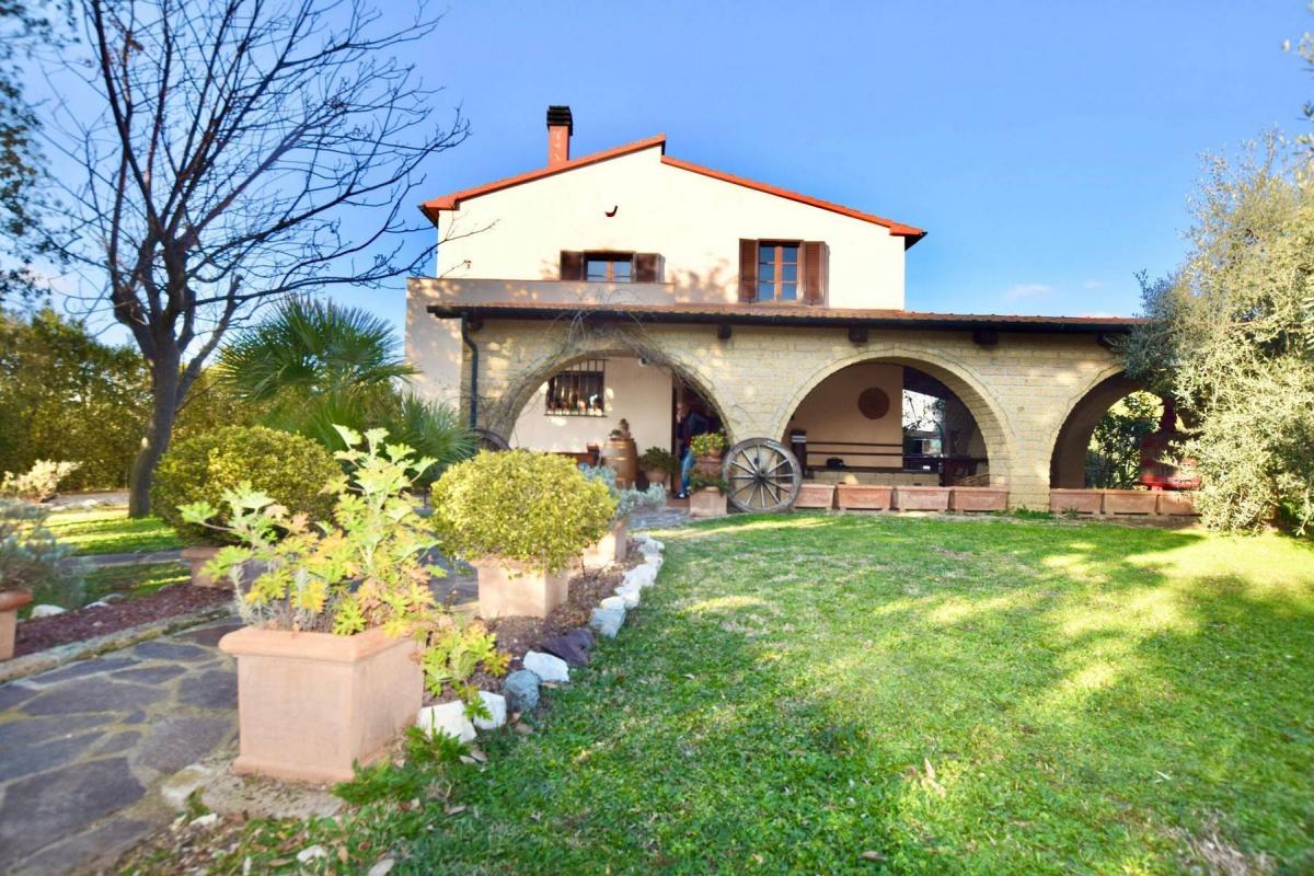 The house is spread over two levels. The ground floor features a large living room with a fireplace, an eat-in kitchen with a fireplace and pantry, a master bedroom, a laundry room, a storage room, and a bathroom. A large portico of about 100 sqm, equipped with an oven and sinks, provides an ideal space for outdoor dining and relaxation amidst the garden's tranquility.