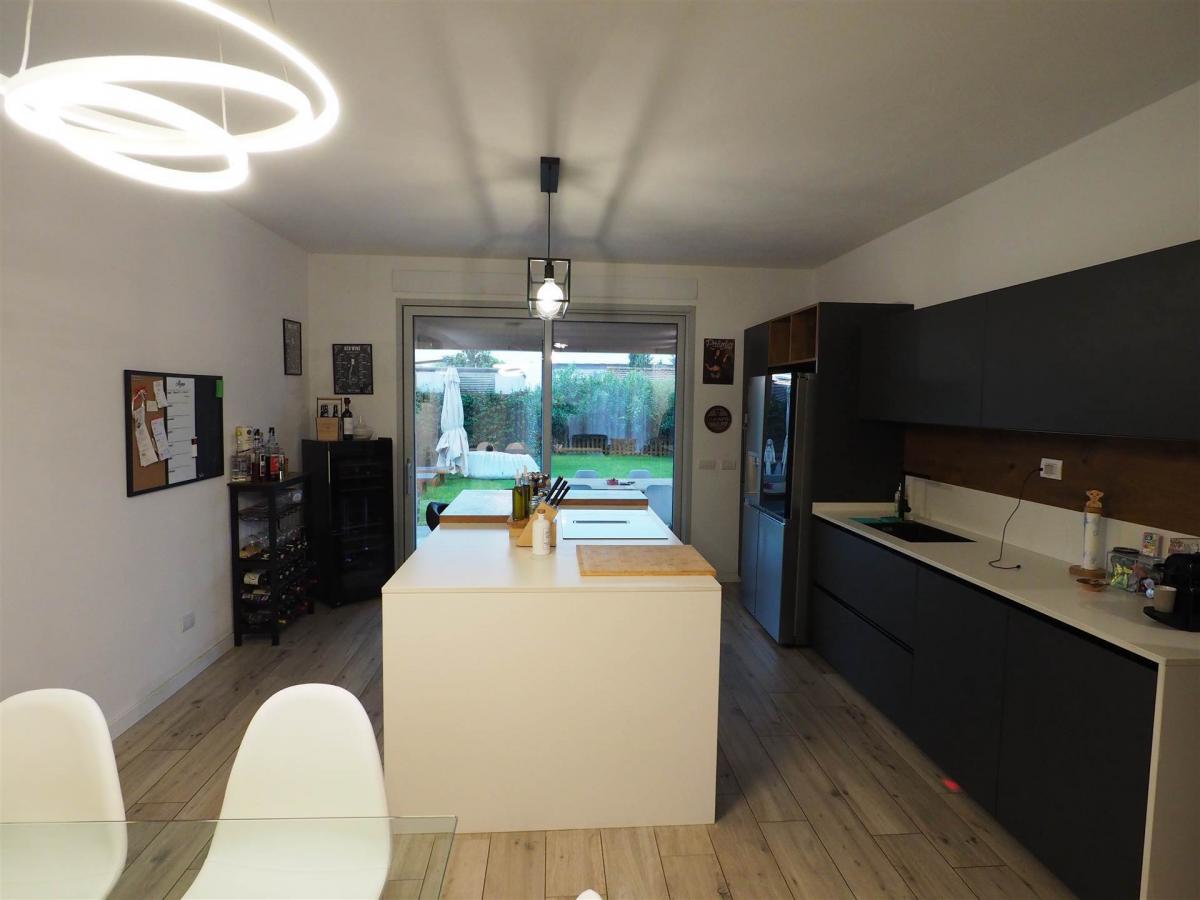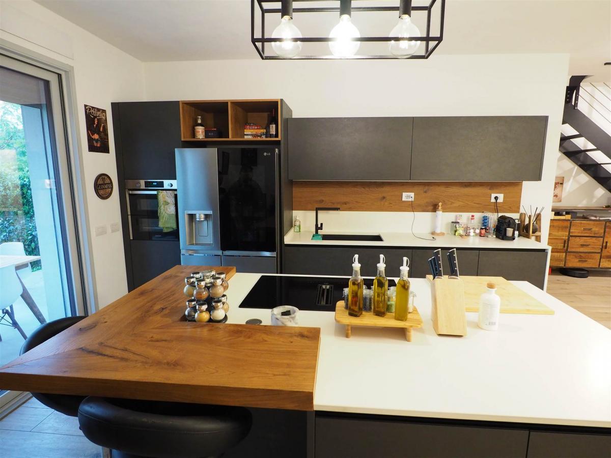 On the ground floor, the independent entrance opens onto a large and bright double living room, enhanced by large windows overlooking the garden. The open-plan kitchen integrates perfectly into the living area, creating a welcoming and contemporary environment. A guest bathroom completes the level.