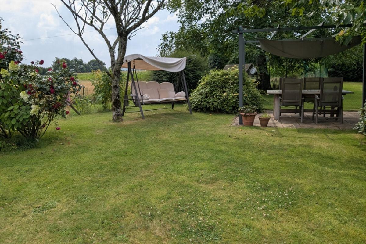 Landscaped garden with fruit trees, and a well.
