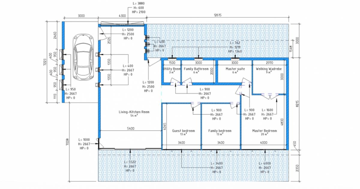Inside the bungalow, there is a large living room, dedicated space for the dining area and kitchen. Further along the corridor are a utility room, two large family and guest bedrooms, a bathroom and a master suite with a dressing room.