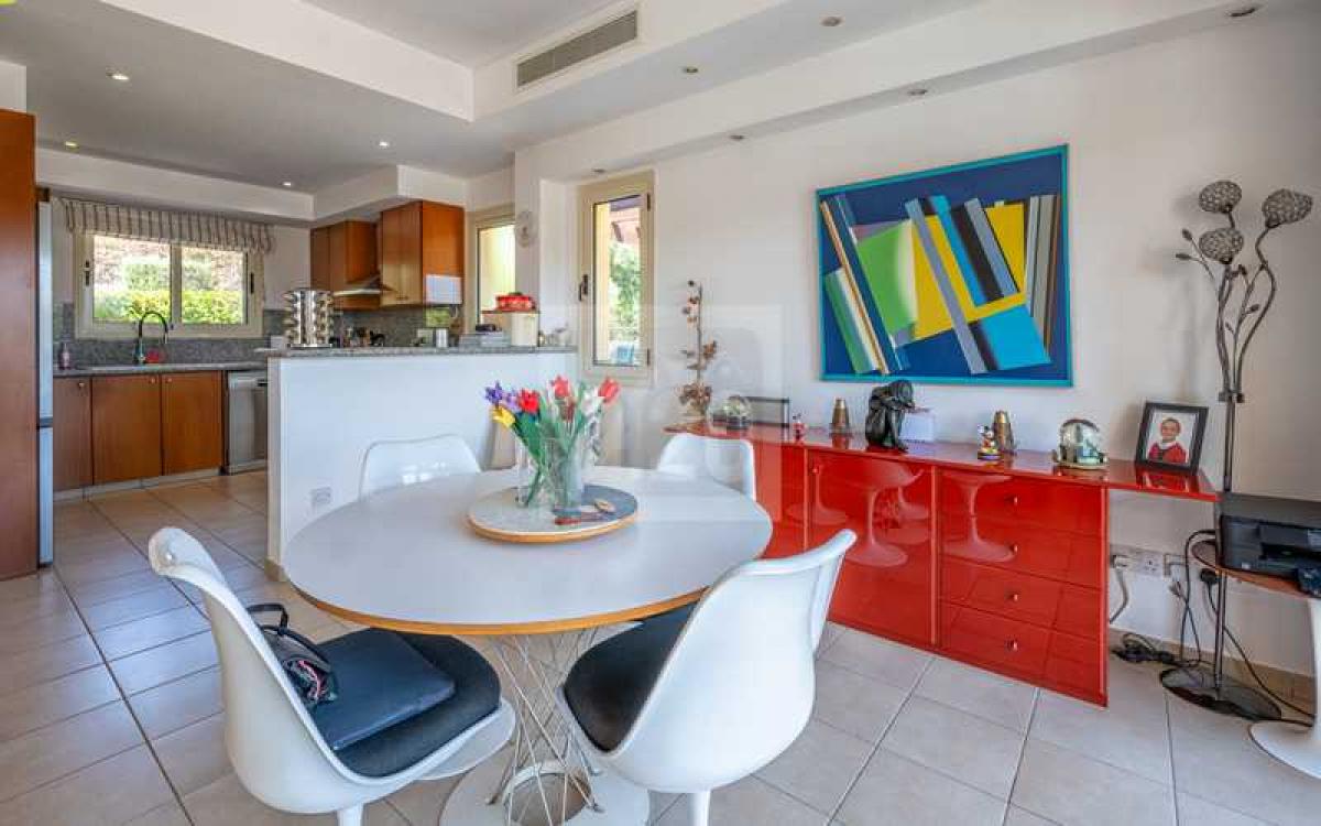 Once through the front door and inside to the open plan lounge it is the quality of the furnishings and finishes which become immediately apparent. Air conditioning is flush fitted into the walls and there is a feature fire place which brings character to the room and is essential for the short Cyprus winter evenings. The lounge is light and bright with bifold triple glass door leading out to the covered terrace with swimming pool and gardens beyond.