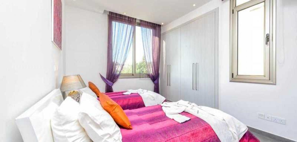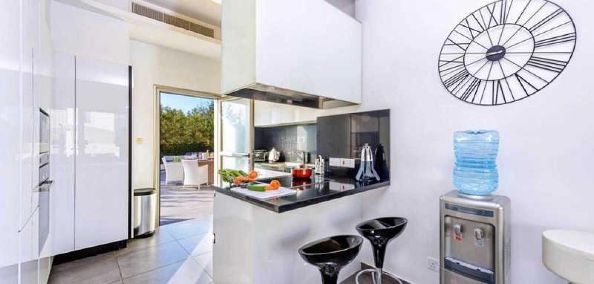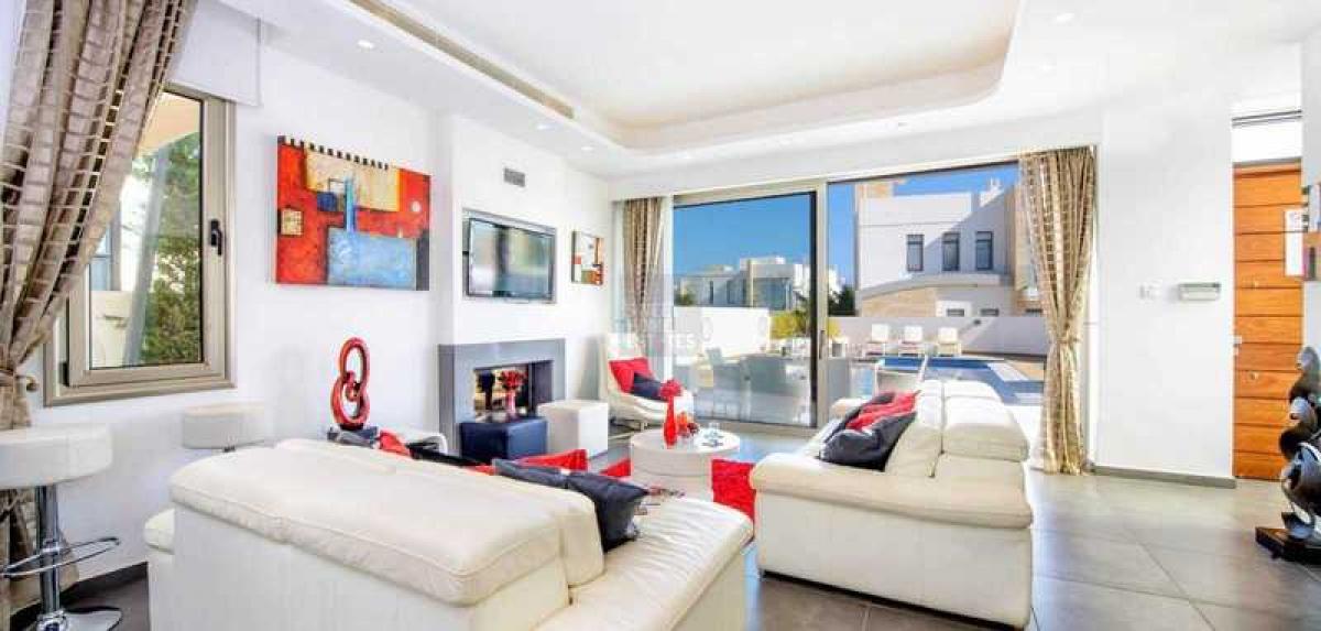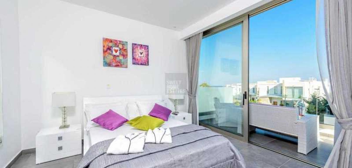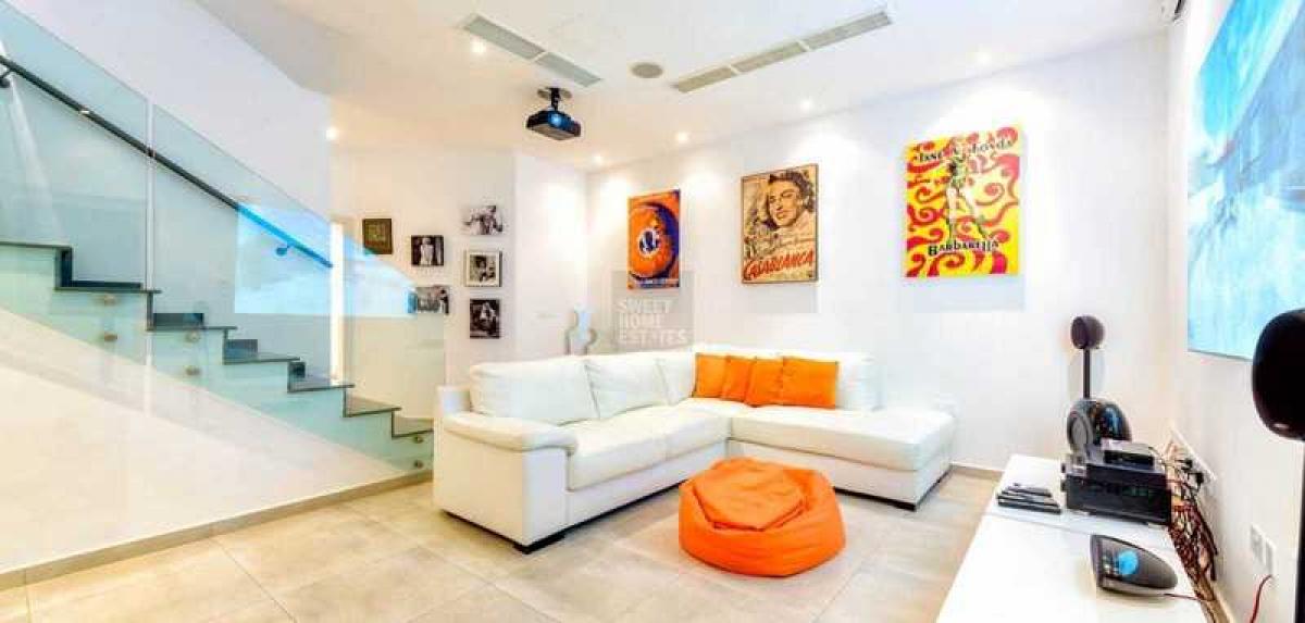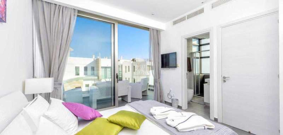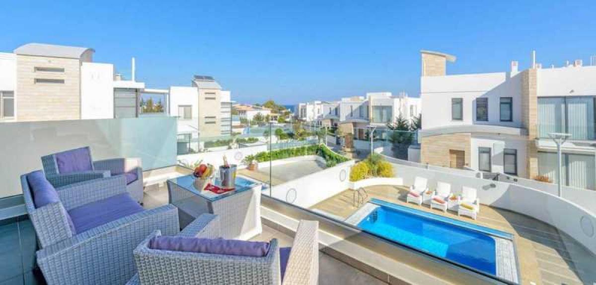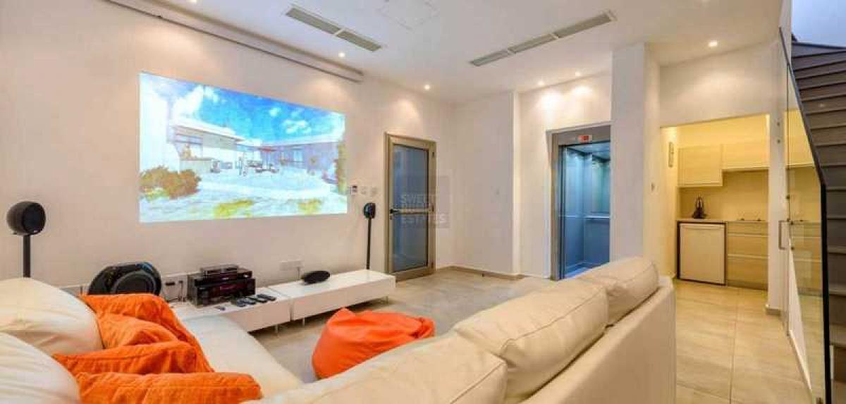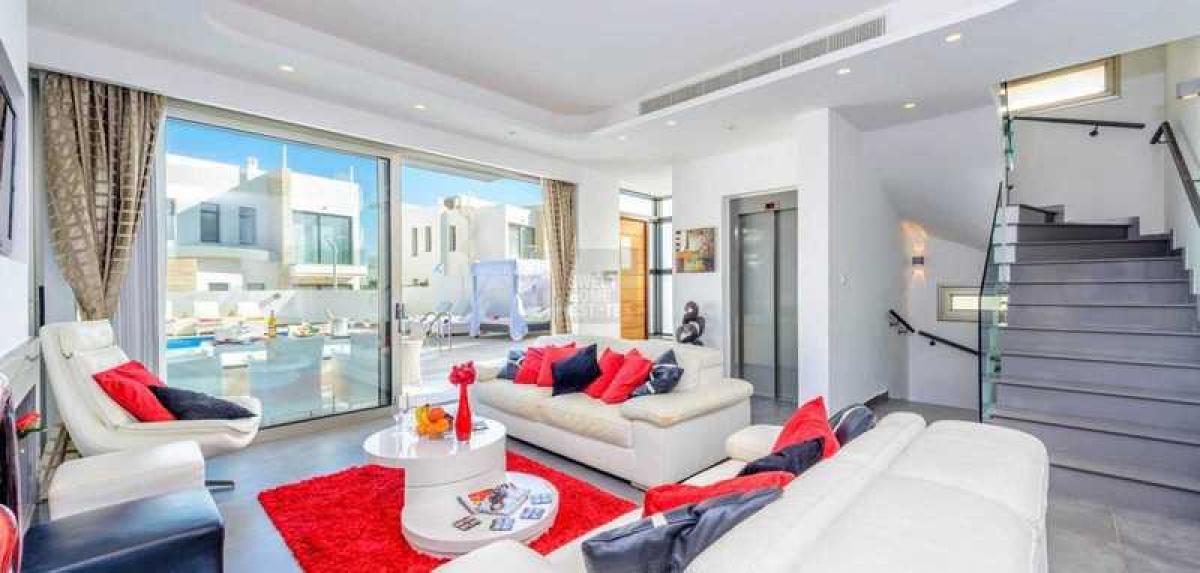 This modern villa located in an exclusive beach front gated community in Protaras area. Winner of multiple property and architecture awards including Virgin's Property Development of the year 2014.This super stylish smart home pairing the privacy and comforts of a homely environment with impressive resort-style amenities. Located in Protaras, between the famous Fig Tree Bay and Konnos Bay, nestled on its own private sandy beach, this modern villa has plenty of comfortable outdoor living space to maximize the panoramic sea views from the front aspect of the villa and the lush hillside view at the rear of the property. This 4-storey villa features private gated access, video entry systems, underground parking with double garage / private entry and a private internal lift to all floors. Ground level provides access for pedestrians only with private beach access (at the end of the garden), pool area, smart home system with Ipad or simple paneling to control blinds and lighting, private roman style infinity swimming pool and a 90 sqm roof garden with outdoor dining and BBQ area with bar. In addition, basement level you will find an exclusive apartment layout with a fully equipped kitchen, breakfast bar, living area featuring a 60-inch 3d TV, Blue Ray DVD, full satellite system, separate dining area and two en-suite twin bedrooms with 40 inch 3D TV's and satellite channels and a Gym. The front aspect has glass by-folding doors to maximise the views and offers comfortable outdoor seating and dining areas overlooking the swimming pool, and garden. The living area also features a 60-inch 3D TV with Blue Ray DVD, satellite channels, Ipad music system, fireplace and comfortable lounge area. The kitchen features all the essentials to include a dishwasher, wine fridge, fridge freezer, coffee machine, and more. Extra features of the property include a private salt water swimming pool.