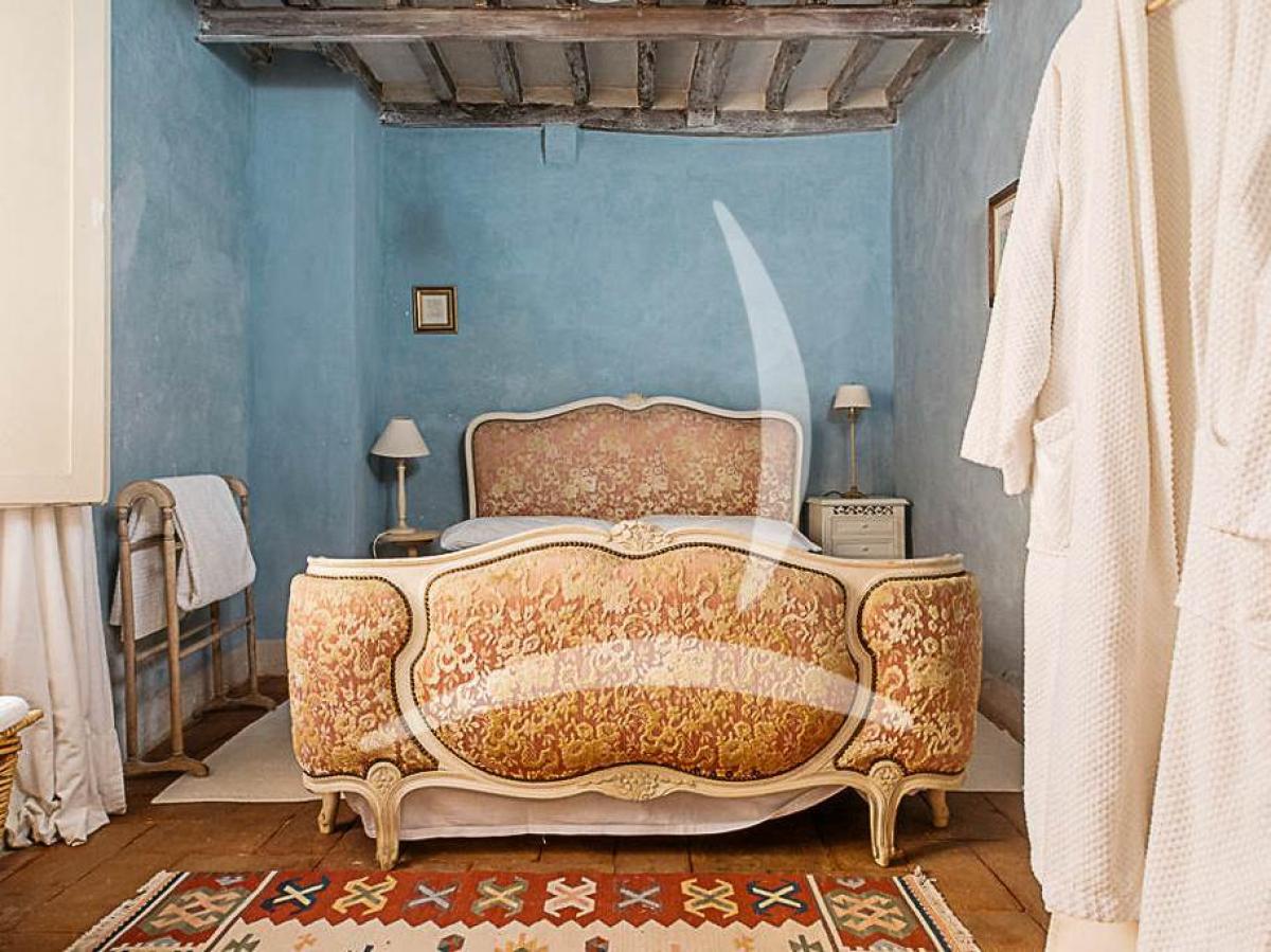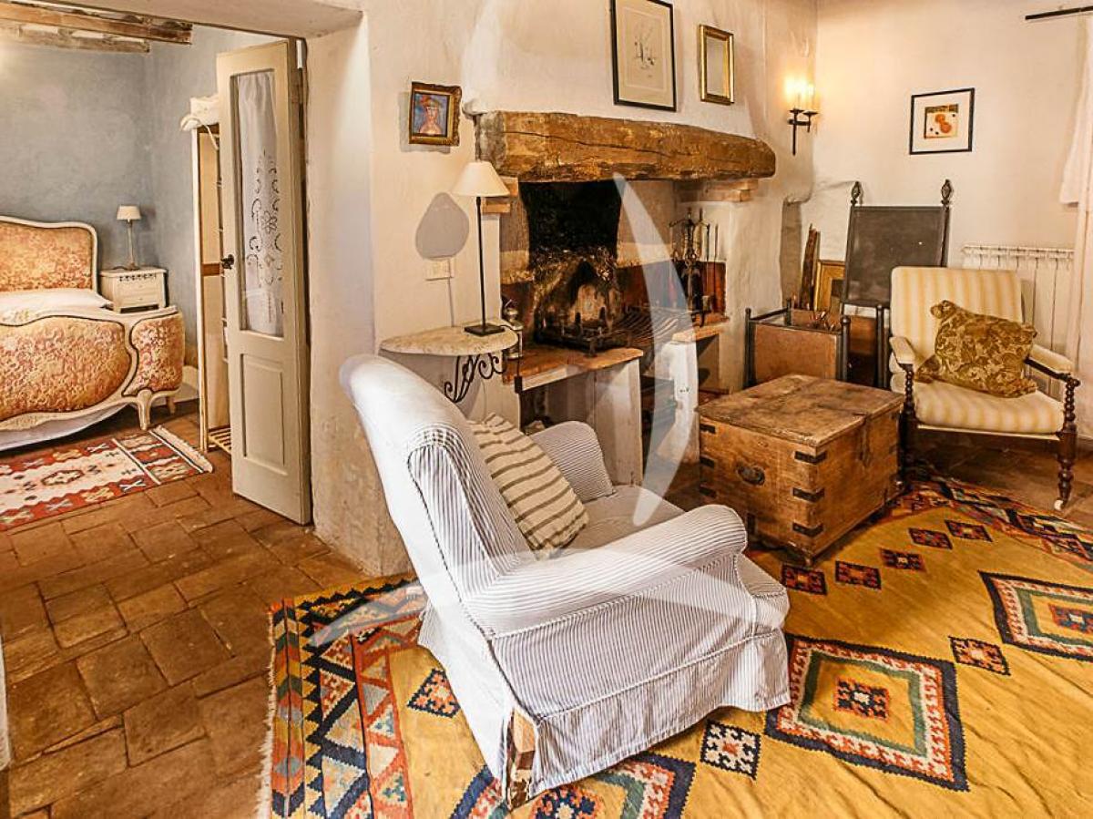 On the first floor there is one bedroom, a living room with fireplace, and a service bathroom on the mezzanine.