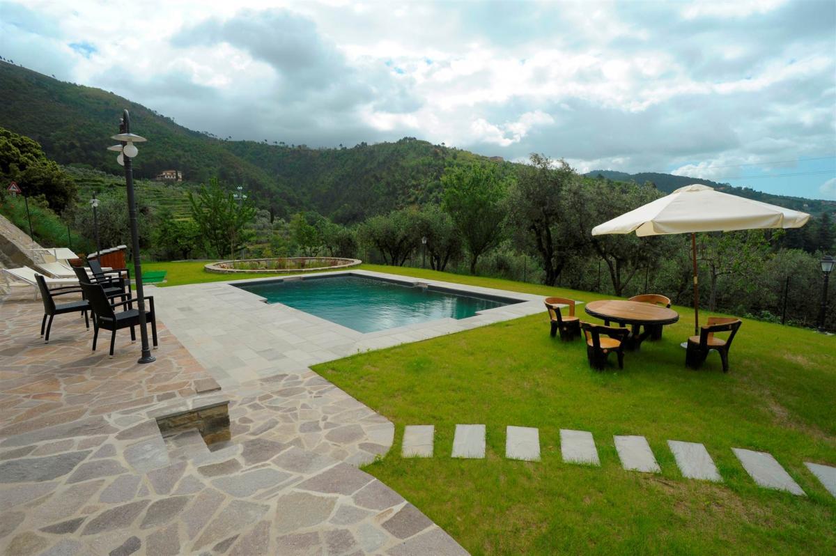 The terraced garden of about 1,740 sqm is a paradise, lovingly tended, with a bio-pool featuring natural phytodepuration, perfectly integrated into the landscape. The breathtaking view of the surrounding hills enhances the exterior, which also includes a wind-sheltered solarium and a bocce court. The harmony of the interiors is reflected in the exterior, where every detail is designed for comfort and well-being. The property also features 7 kW/h photovoltaic panels, solar thermal panels for 500 liters of hot water, and rainwater collection systems for garden irrigation and WC flushing. Additionally, the basement houses a sauna, panoramic whirlpool, and a fitness area for complete wellness.