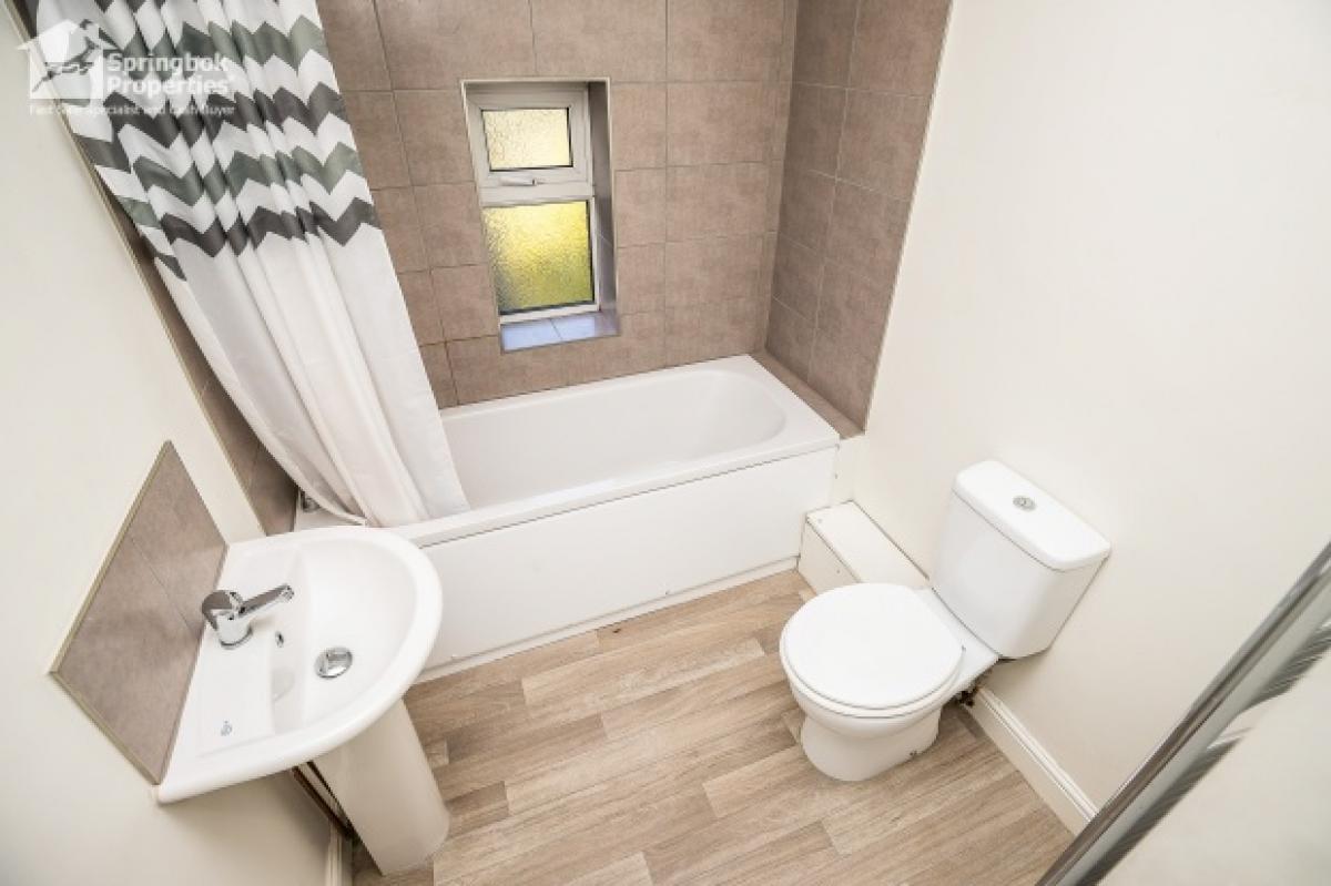 Upstairs, the landing gives access to two double bedrooms. The main bedroom faces the front and offers a generous layout, while the second bedroom overlooks the garden and includes direct access to the modern bathroom. The bathroom is fitted with a three-piece suite comprising a bath with wall-mounted shower, pedestal basin, and low flush W.C., with part-tiled walls and wood-style flooring completing the space.