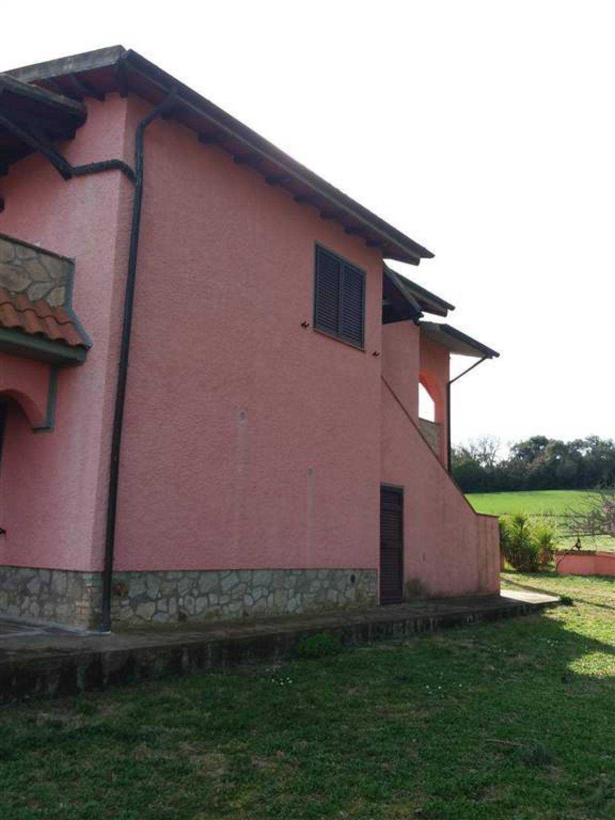 The property also includes about 5 hectares of land, 4 hectares of which are used for arable farming, with the remainder dedicated to an olive grove with 240 productive trees, and an enclosed park. The property is accessed via an automatic gate. Additionally, there is a garage of about 40 sqm for storage, and a well for water supply.