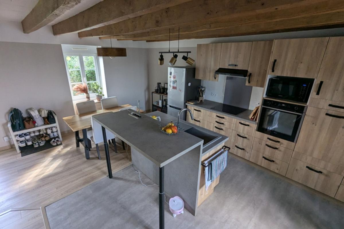 Pretty country house for sale in the commune of Ruffiac (halfway betweeen Malestroit/La Gacilly), comprising a cellar on a concrete slab, on the ground floor, a spacious lounge/dining room with a pellet stove, a WC, and a shower room; upstairs, a study or spare bedroom, two other double bedrooms. As an annex a garage and a light construction outbuilding. A well. Nice adjoining ground of approx. 7425 m2. TO DISCOVER QUICKLY! (5.50 % fees incl. VAT at the buyer's expense.)Further informations