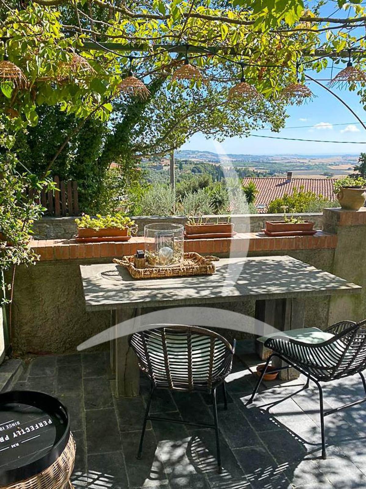 The property is surrounded by approximately 700 sqm of private garden offering breathtaking panoramic views of the Tuscan countryside and extending to the island of Elba. Outdoor features include a natural stone terrace of 16 sqm, a larger 38 sqm terrace with a carport, and a fully equipped outdoor kitchen with barbecue, fridge, induction hob, and sink—perfect for outdoor dining.
