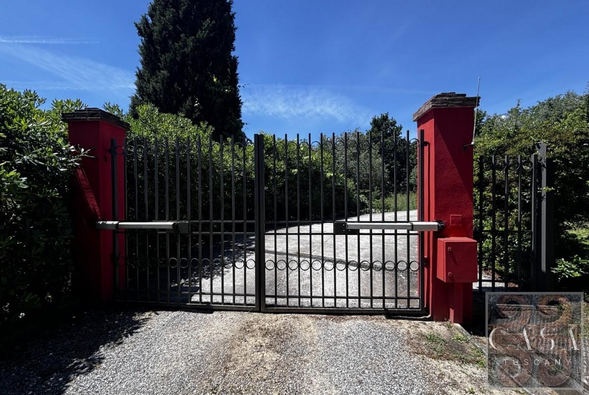 A private road leads to an automatic gate which opens onto the yard in front of the house. On the right there's a short paved road leading to covered parking.