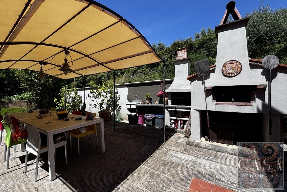 The kitchen leads outside to the barbecue area where there's a pizza oven too, and also into the veranda which has a nice traditional wood stove.