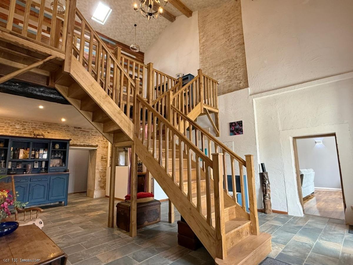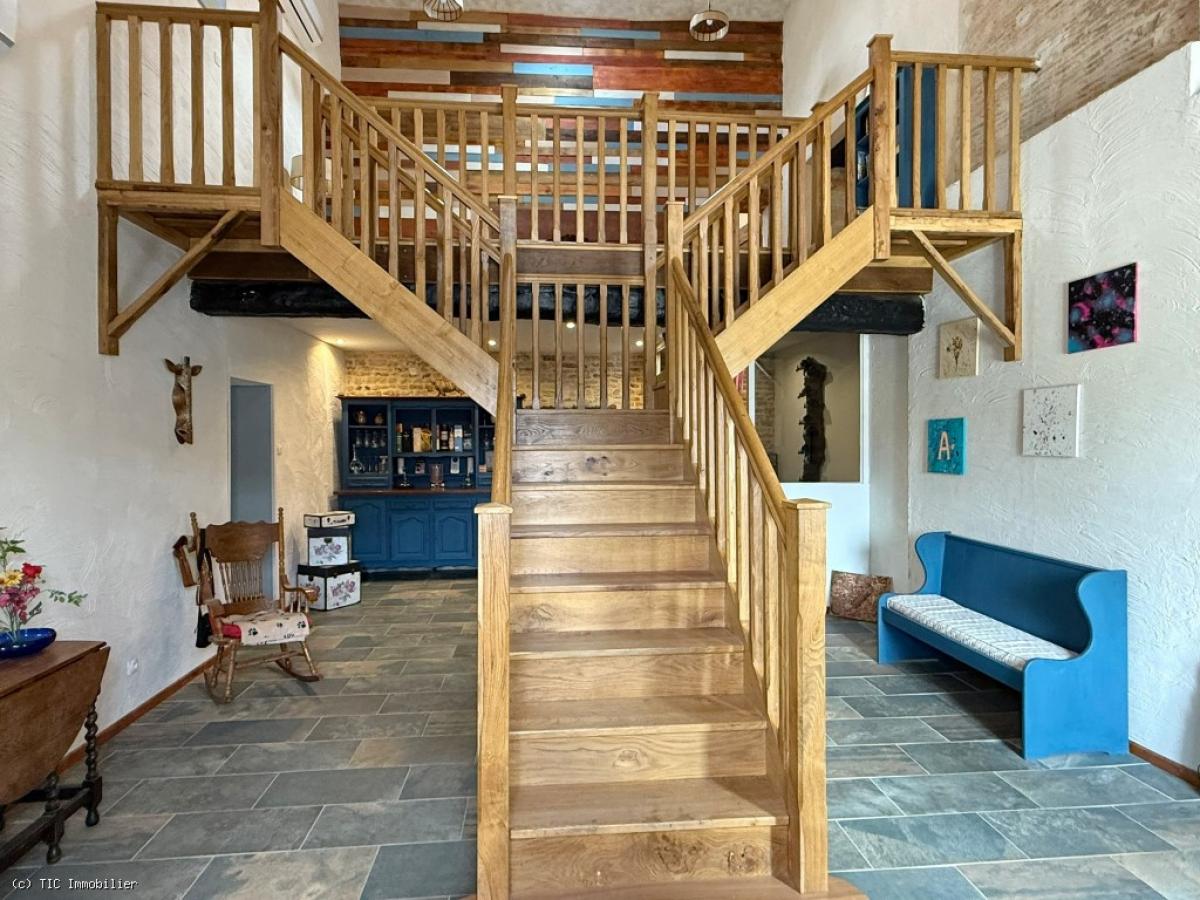 Entrance hall (21m2) with a corner bar area, and an artisan made double staircase leading to the mezzanine. Tiled floor, exposed stone and beams.