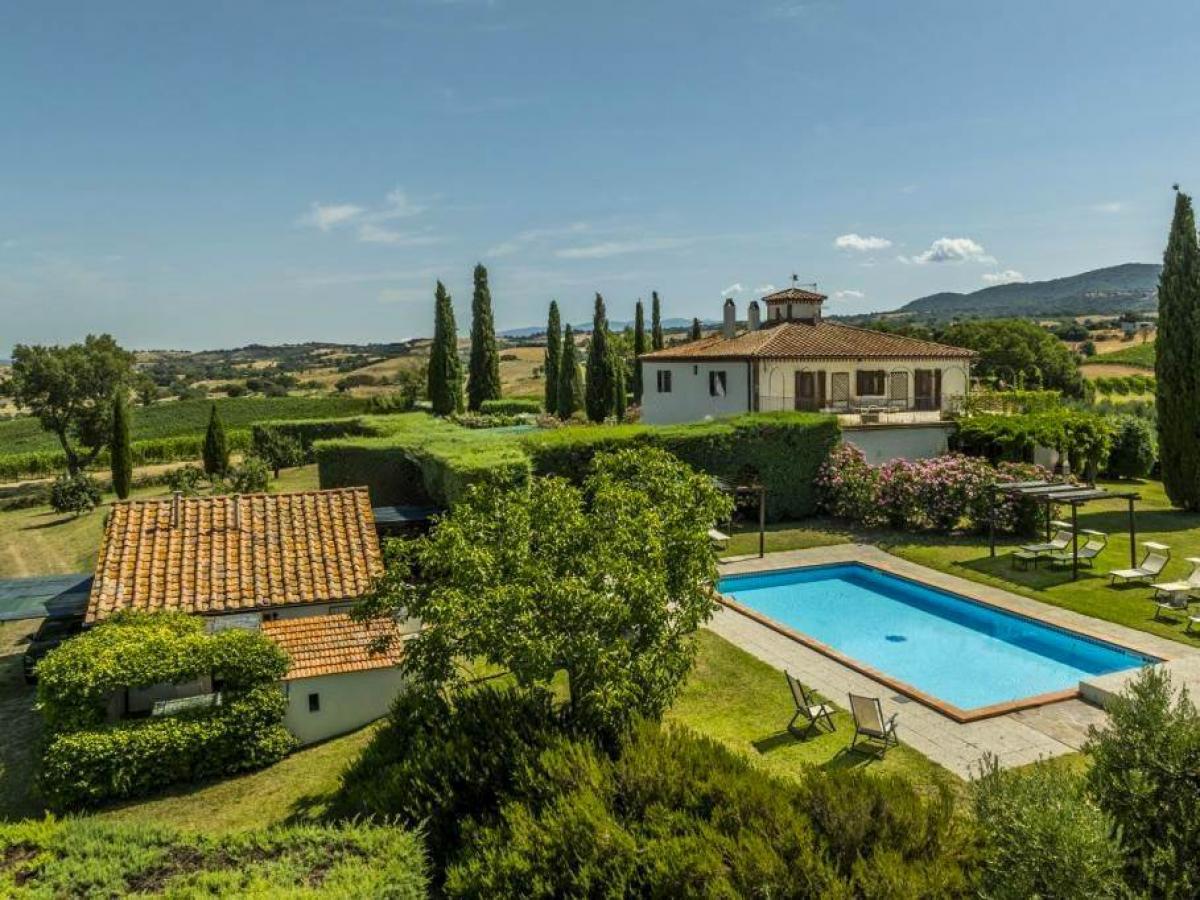 The property is surrounded by a meticulously landscaped park accessed via a grand electric gate. The complex includes two annexes (independent two-room apartments with private courtyards) currently used as an agritourism business. The outdoor spaces are designed for ultimate relaxation, featuring a 6x12 meter swimming pool surrounded by gazebos and flowered hedges. The 6-hectare estate houses a 5-hectare intensive olive grove with 1246 trees, producing approximately 3000 kg of high-quality extra virgin olive oil. An artesian well ensures water autonomy. The location is strategic: in the heart of the Morellino di Scansano wine region, just 25 km from the beaches of Castiglione della Pescaia and Capalbio, and close to the Saturnia Thermal Baths.