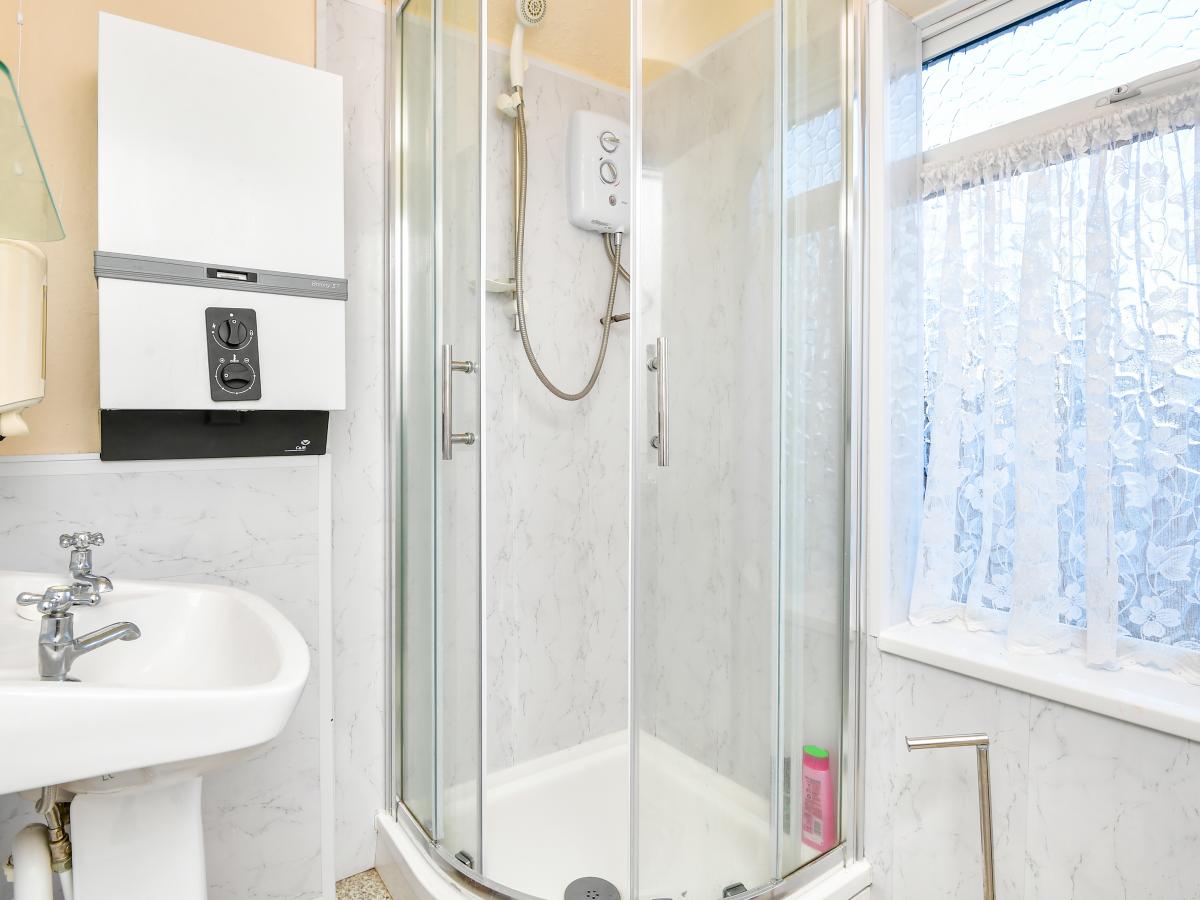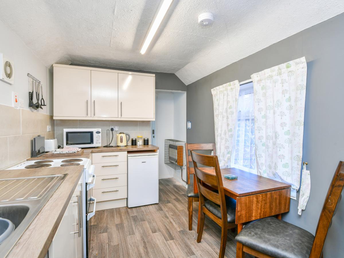 To the rear, the kitchen is fitted with a modern range of units and benefits from natural light and direct access to the courtyard terrace. This external space is paved and enclosed, offering a practical area for seating or secure off-road parking behind double gates. A brick-built outbuilding adds versatility, whether for storage, workshop use or even future conversion, subject to needs.