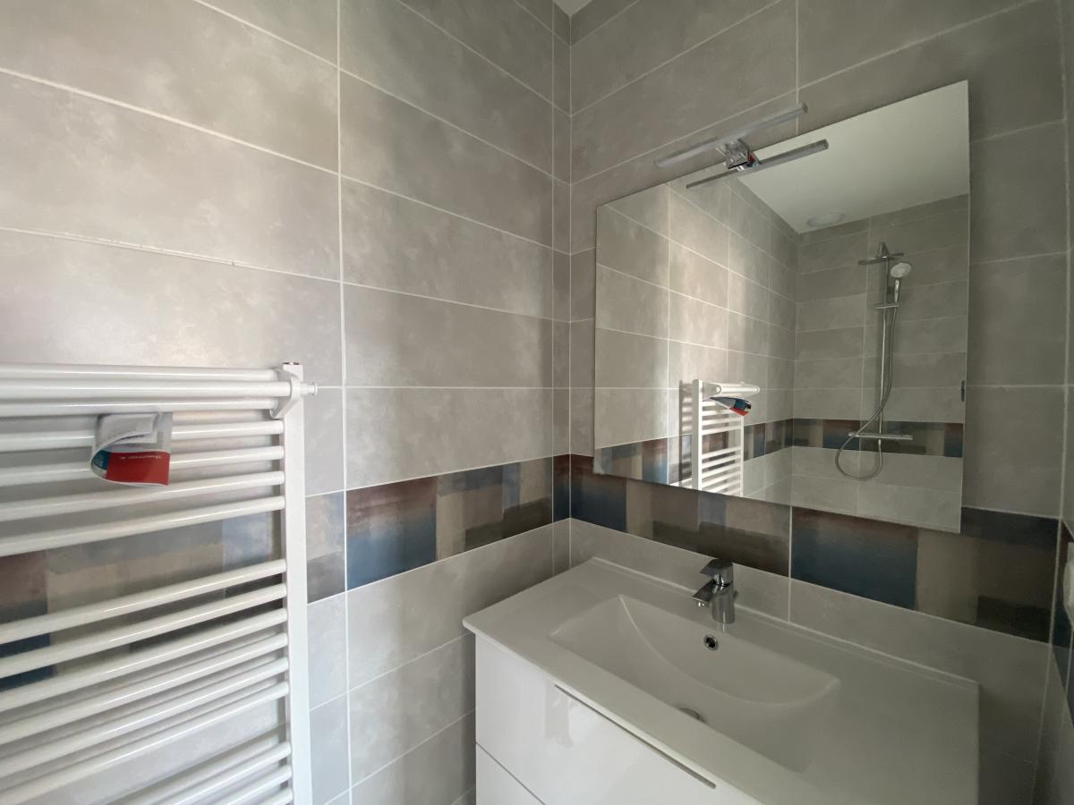 Exterior = 2 parking spaces + terrace of 30 m2 + landscaped garden (gray and white gravel, approximately 4/5 trees, hedgerow) + fence with privacy slats.