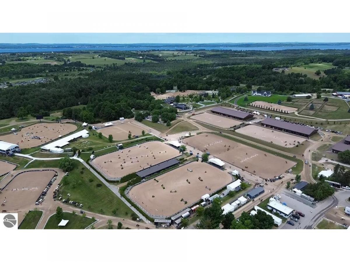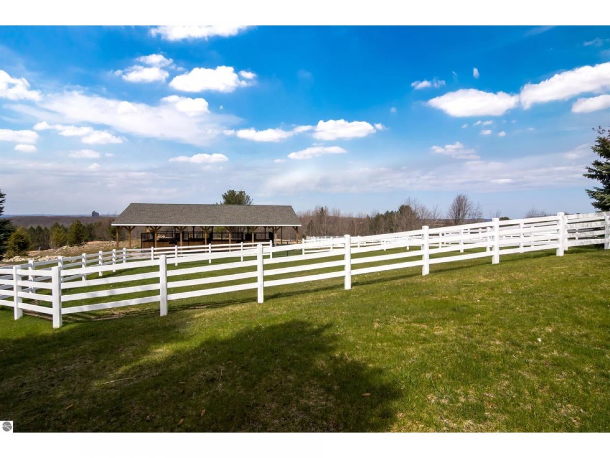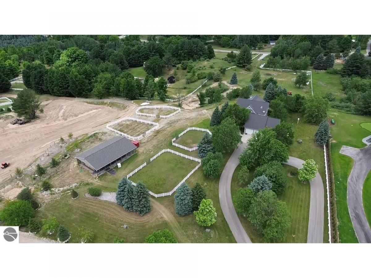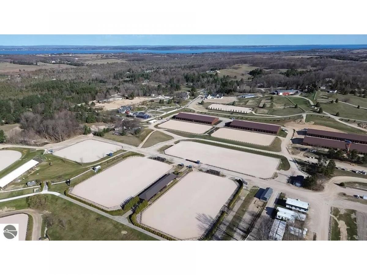 SPECTACULAR 5 ACRE SETTING situated on a private lane servicing only three homes in the heart of Flintfields and the Traverse City Horse Shows discover this newly listed estate. This luxurious offering for the equine enthusiast is ready to welcome you home. As you begin your tour you will discover impressive features throughout including expansive living spaces, Brazilian Cherry floors, hand chiseled slate floors and boasting 5 bedrooms, 3 ½ baths the possibilities are limitless. A well-appointed great room and dining room with a stone fireplace will be the indoor gathering place. A chef’s kitchen with professional style appliances, Subzero refrigerator/freezer, island with seating, gorgeous custom cabinetry, granite countertops; butler’s pantry and great views of the schooling ring. The light filled four season sunroom is great for curling up with a good book or the ideal “work from home” spot. The primary owner’s suite is enhanced by a fireplace, glorious views, washer/dryer combo and a soaking tub in the ensuite full bath. Walkout lower level with family room, fireplace, second kitchen, laundry room and more. Additional amenities include a 3-car garage, freshly painted interior, Geo Thermal HVAC system, immaculate and move in ready with most furnishings included. A wrap around deck will be a gathering place for your friends and family, relax on the brick patio or gather around the firepit to share stories. You will be impressed by the amazing views of the GT Peninsula and beyond. Equine features include a barn with 12 (10x12) stalls; 4 paddocks made of Amberline HDPE 4 rail fencing; plenty of room to build an arena and to add more paddocks and a second barn if desired. Equestrian Families, this is the opportunity you have been waiting for in northern Michigan, privacy, security and direct access to Flintfields with no roads to cross and just a short walk to the VIP tent.